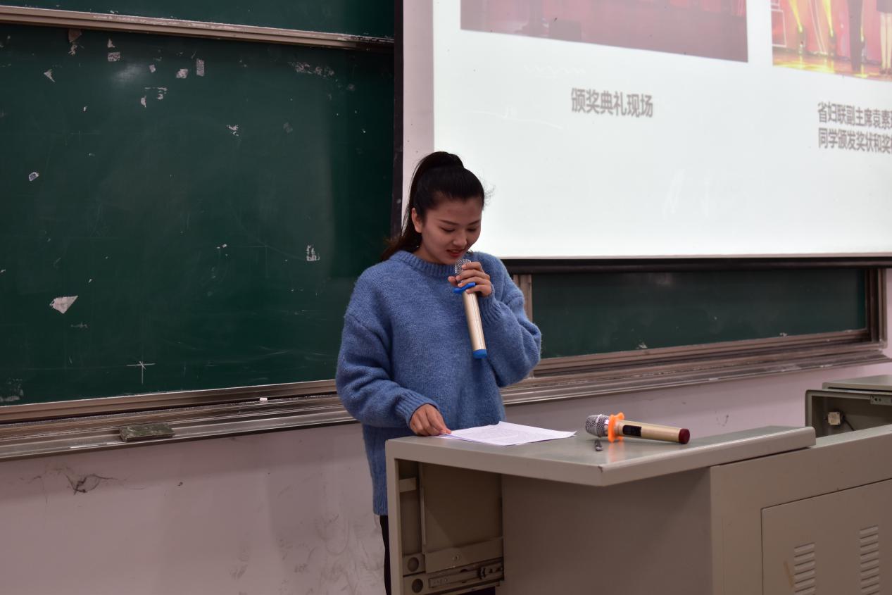 隨后,林鋮老師對黃源佳的獲獎經歷進行了介紹。林鋮老師在介紹中強調,黃源佳從未想過放棄自己,而是讓她更加明白了生命的可貴,面對病魔黃源佳卻從不后退,命運無常但她決不放棄。林鋮老師介紹說:“黃源佳同學上臺領獎時,主持人請她分享一下自己此刻最想說的話。她說,她始終相信越努力,越幸運?!绷咒吚蠋煆娬{,黃源佳出身于貧困生的家庭,加上疾病的折磨,不但沒有擊垮她,反而給了她強大的毅力,三年來她從未想過放棄自己,而是讓她更加明白了生命的可貴。作為新時代的青少年,同學們更應該弘揚和學習她的精神,認真學習黃源佳同學自立自強的作風,從現(xiàn)在做起,從小事做起,展現(xiàn)我系學子風采。