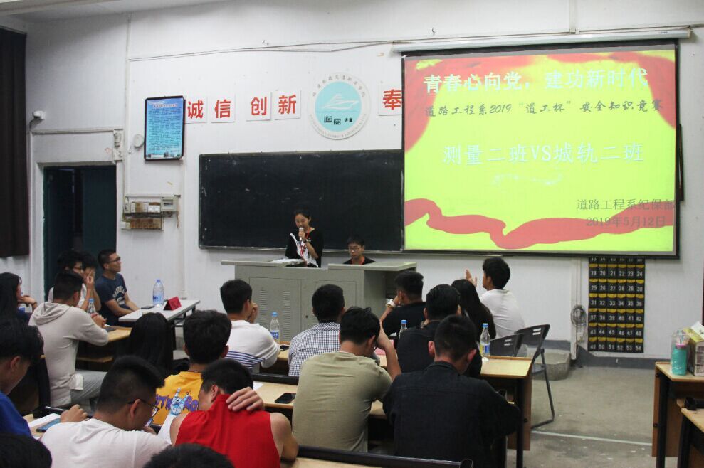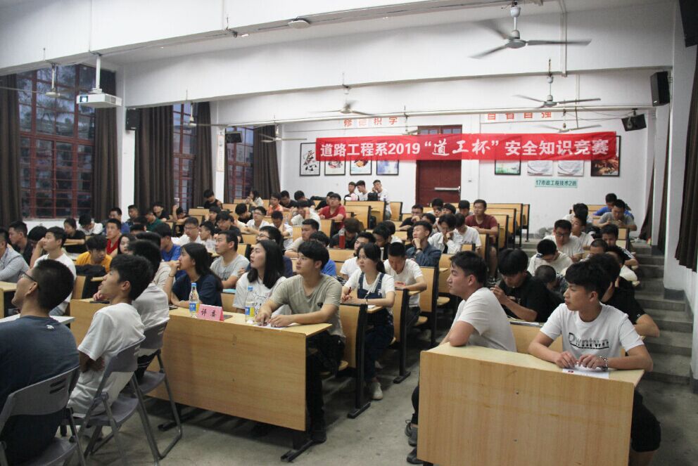 為加強(qiáng)同學(xué)們的安全防護(hù)意識,減少和防止人身傷害,促進(jìn)養(yǎng)成良好的生活習(xí)慣,道路工程系于2019年4月25日在8號樓土一、土二階梯教室舉辦了“道工杯”安全知識競賽。