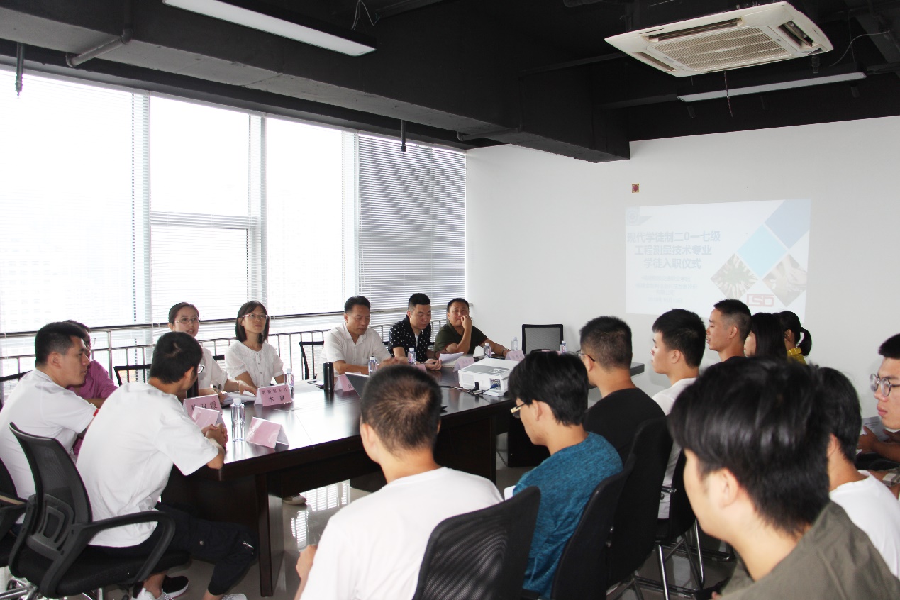 2019年10月13日上午,現(xiàn)代學(xué)徒制工程測(cè)量技術(shù)專業(yè)2017級(jí)入職儀式在福建金創(chuàng)利信息科技發(fā)展股份有限公司隆重舉行。福建省制圖院林院長(zhǎng),福建省地質(zhì)勘察院林工,福建省測(cè)繪院官工,福建省閩北地質(zhì)大隊(duì)林工,道路工程系黃穎副主任,工程測(cè)量技術(shù)專業(yè)教研室全體教師出席了此次活動(dòng)。入職儀式由學(xué)工程測(cè)量技術(shù)專業(yè)教研室主任李琳老師主持。