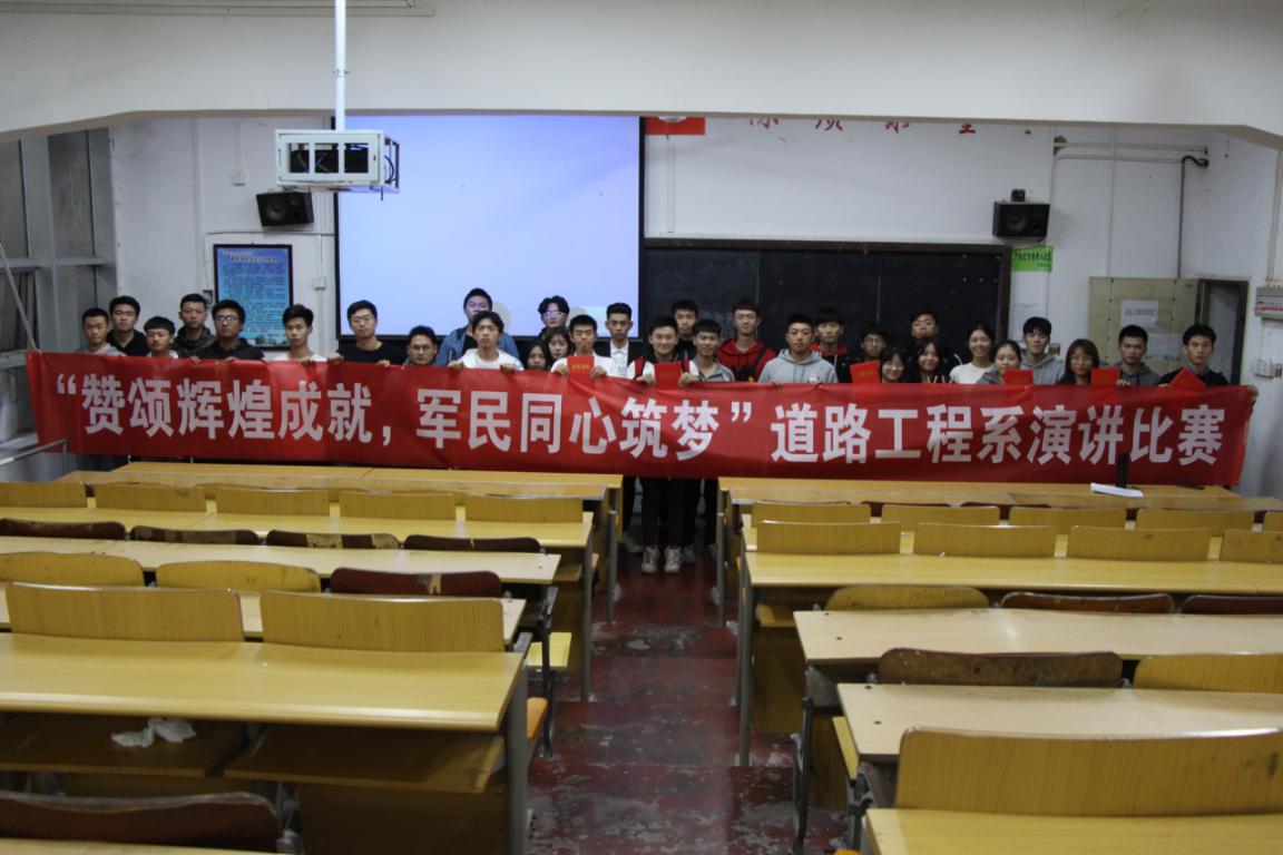 為了激發(fā)同學(xué)們的紅色血脈,不忘愛(ài)國(guó)初心、矢志強(qiáng)國(guó)的政治熱情,展示我系學(xué)生濃厚的愛(ài)國(guó)熱情和蓬勃向上的精神風(fēng)貌,2019年11月28日,道路工程系在高蓋山2號(hào)樓102教室舉辦“贊頌輝煌成就 軍民同心筑夢(mèng)”演講比賽。