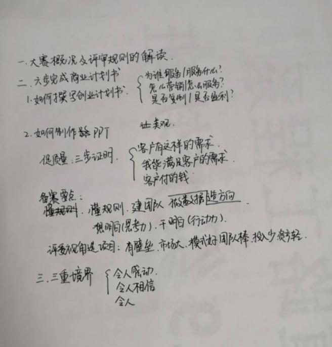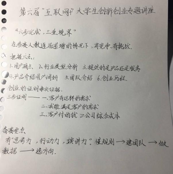 講座中,曹老師還圍繞用戶痛點、行業(yè)類型分析、提供產品or服務、介紹與用戶調研、團隊介紹、創(chuàng)業(yè)歷程等方面,詳細講解了項目團隊組建、項目挖掘和遴選、項目培育等要領,點明同學們需要具備“思考力,行動力,演講力”,活用事實證據進行三步證明,令同學們對本次比賽情況和所需條件有了更加系統(tǒng)的了解。講座內容層次漸進,通俗易懂,令人印象深刻,同學們對精彩的內容進行摘錄、備注。