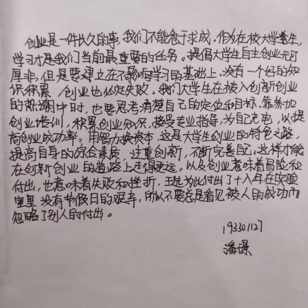 當今的社會,是科學技術突飛猛進的時代,人們生活方式也發(fā)生著翻天覆地的變化,機會與挑戰(zhàn)共存,風險與利益同在,大學生在選擇自主創(chuàng)業(yè)的同時,也要審時度勢。通過這次的創(chuàng)新創(chuàng)業(yè)大賽主題講座,讓我對創(chuàng)新創(chuàng)業(yè)有了更深刻的認識,也讓我看到了自己的不足以及與他人之間的差距。在以后的學習生活過程中,我也將不斷修正提升自己。衷心希望學校能夠多舉辦創(chuàng)新創(chuàng)業(yè)一類的賽事,培養(yǎng)更多具有創(chuàng)新創(chuàng)業(yè)素質的人才,提高大家的創(chuàng)業(yè)水平,鼓勵大家“創(chuàng)新,創(chuàng)業(yè),創(chuàng)未來”。