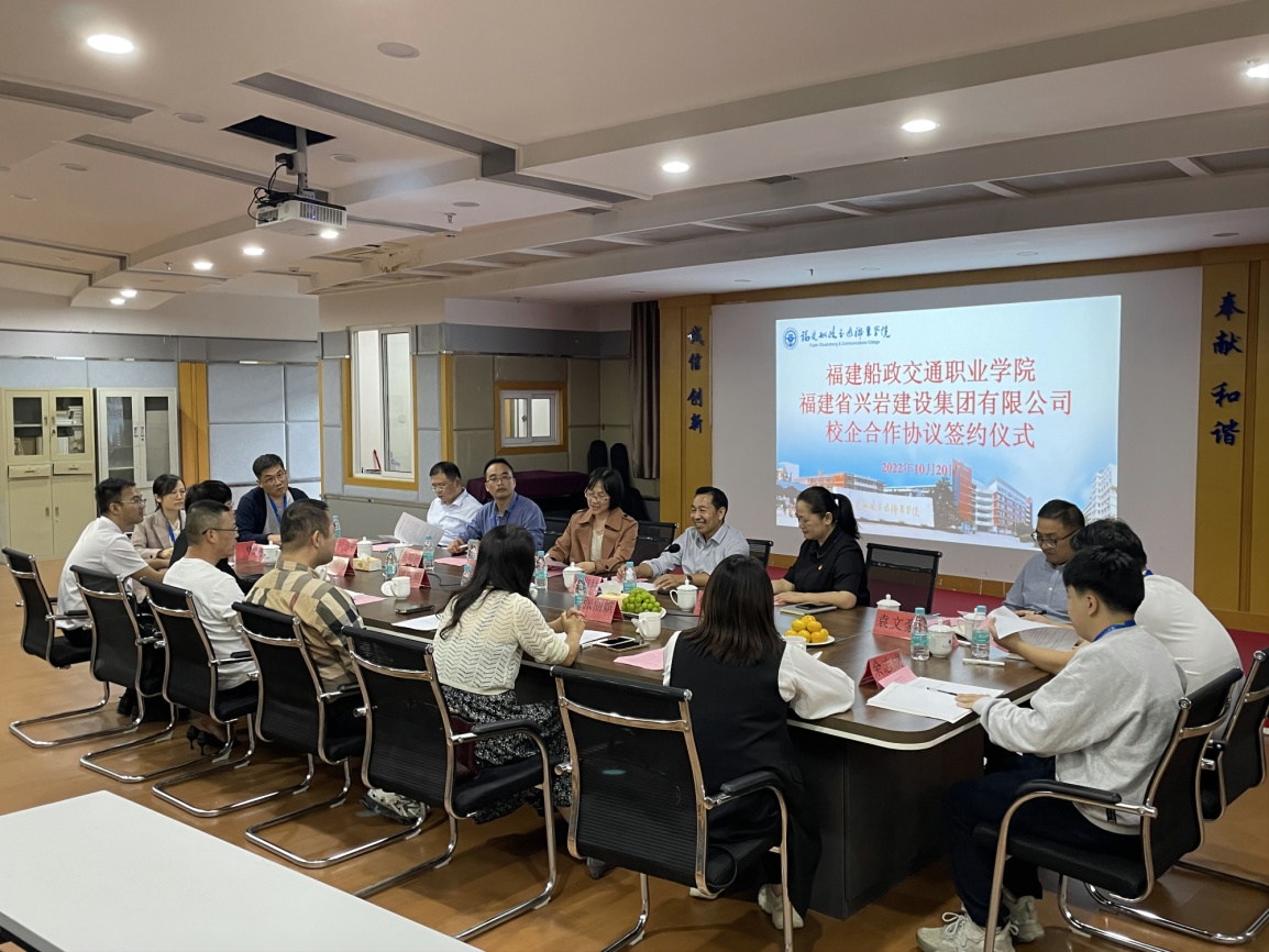 2022年10月20日下午,為了深入推進(jìn)產(chǎn)教融合、校企合作,提升人才培養(yǎng)質(zhì)量,福建船政交通職業(yè)學(xué)院與福建省興巖建設(shè)集團(tuán)有限公司舉行校企合作協(xié)議簽訂并授牌儀式。本次簽約授牌儀式在創(chuàng)新樓1007舉行,出席的企業(yè)代表有總經(jīng)理葉永斌、副總經(jīng)理張麗嬪、總工程師鄭東明等其他企業(yè)部門負(fù)責(zé)人,校方代表有張祖柱副院長(zhǎng),土木工程學(xué)院黨政領(lǐng)導(dǎo)及專業(yè)帶頭人。