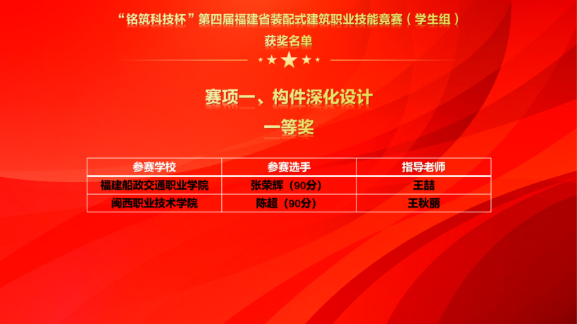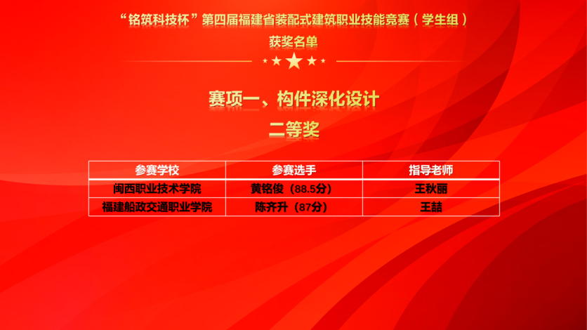 在本項(xiàng)賽事中,我院共有6名選手參加深化設(shè)計(jì)和構(gòu)件制作與安裝兩個賽項(xiàng)的比賽,其中選手20級建筑工程技術(shù)專業(yè)張榮輝同學(xué)在王喆、代庭葦、高巧玲等裝配式建筑教師團(tuán)隊(duì)的指導(dǎo)下,在深化設(shè)計(jì)賽項(xiàng)中勇奪桂冠,榮獲一等獎。陳齊升同學(xué)和王志濤同學(xué)分別榮獲深化設(shè)計(jì)二等獎和三等獎,葉紹龍同學(xué)榮獲構(gòu)件制作與安裝賽項(xiàng)三等獎。