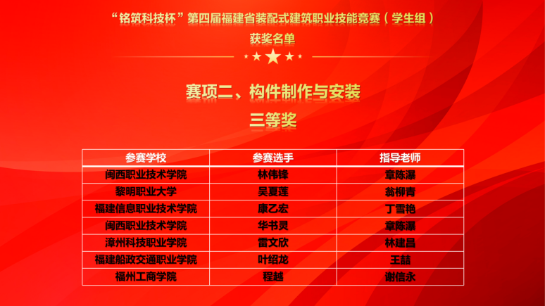 2022年11月12日,第五屆全國裝配式建筑職業(yè)技能競賽“裝配式建筑施工員”賽項(xiàng)福建省選拔賽暨“銘筑科技杯”第四屆福建省裝配式建筑職業(yè)競賽在福建船政交通職業(yè)學(xué)院成功舉辦。因疫情原因,本項(xiàng)賽事學(xué)生組通過線上競賽的形式進(jìn)行,福建省10所院校(包括本科、高職等各類院校)共計(jì)42名選手參加本項(xiàng)賽事。