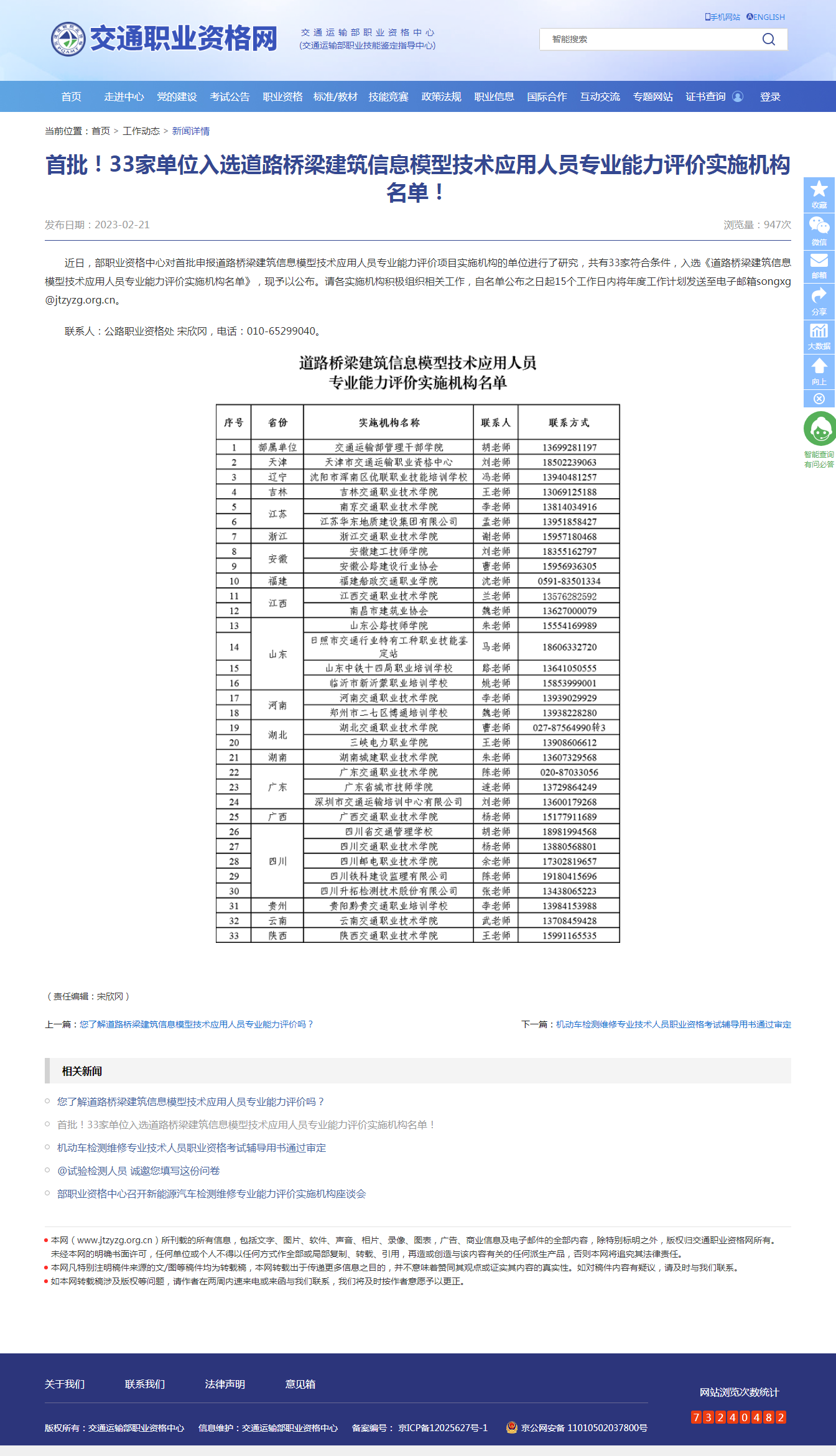 2023年2月21日,交通運輸部職業(yè)資格中心公布了首批申報道路橋梁建筑信息模型技術(shù)應(yīng)用人員專業(yè)能力評價項目實施機構(gòu)名單,我院成功入選。