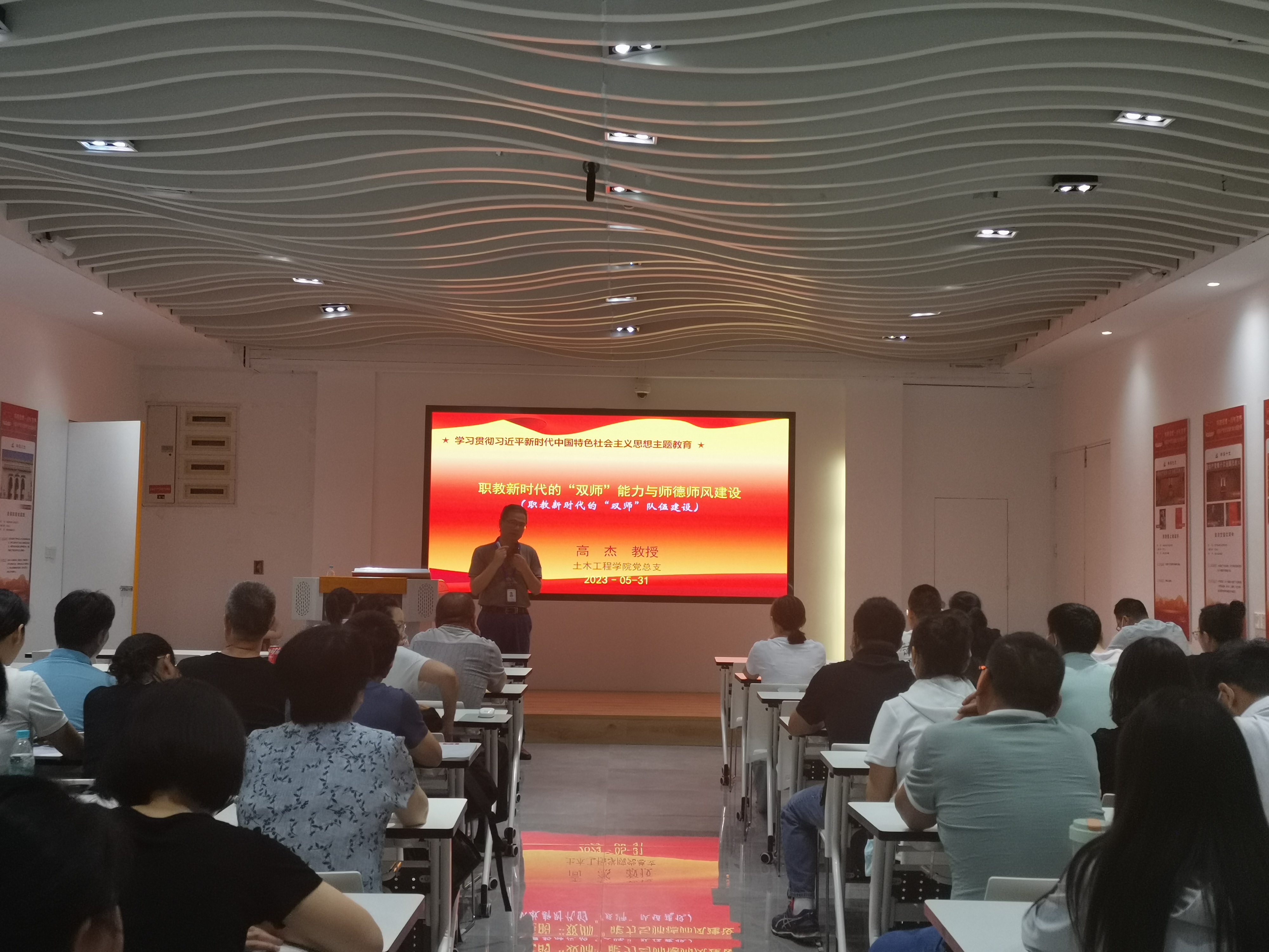 為全面貫徹黨的二十大精神,深入開展學(xué)習(xí)貫徹習(xí)近平新時代中國特色社會主義思想主題教育,實(shí)施“深學(xué)爭優(yōu)、敢為爭先、實(shí)干爭效”行動,5月31日下午,土木工程學(xué)院黨總支書記高杰同志在鑒知樓三樓黨建暨船政文化研究研學(xué)中心以《職教新時代的“雙師”能力與師德師風(fēng)建設(shè)》為題,上主題教育專題黨課并作同題學(xué)術(shù)講座,土木工程學(xué)院領(lǐng)導(dǎo)班子成員、副科級以上干部、黨員教師等參加。