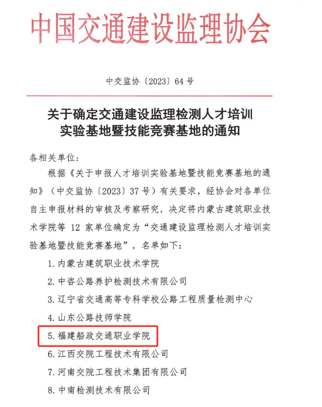 日前,在中國交通建設(shè)監(jiān)理協(xié)會組織的交通建設(shè)監(jiān)理檢測人才培訓(xùn)實驗基地暨技能競賽基地評審認定工作中,我院交通土建專業(yè)群實訓(xùn)基地成功入圍并獲批。
