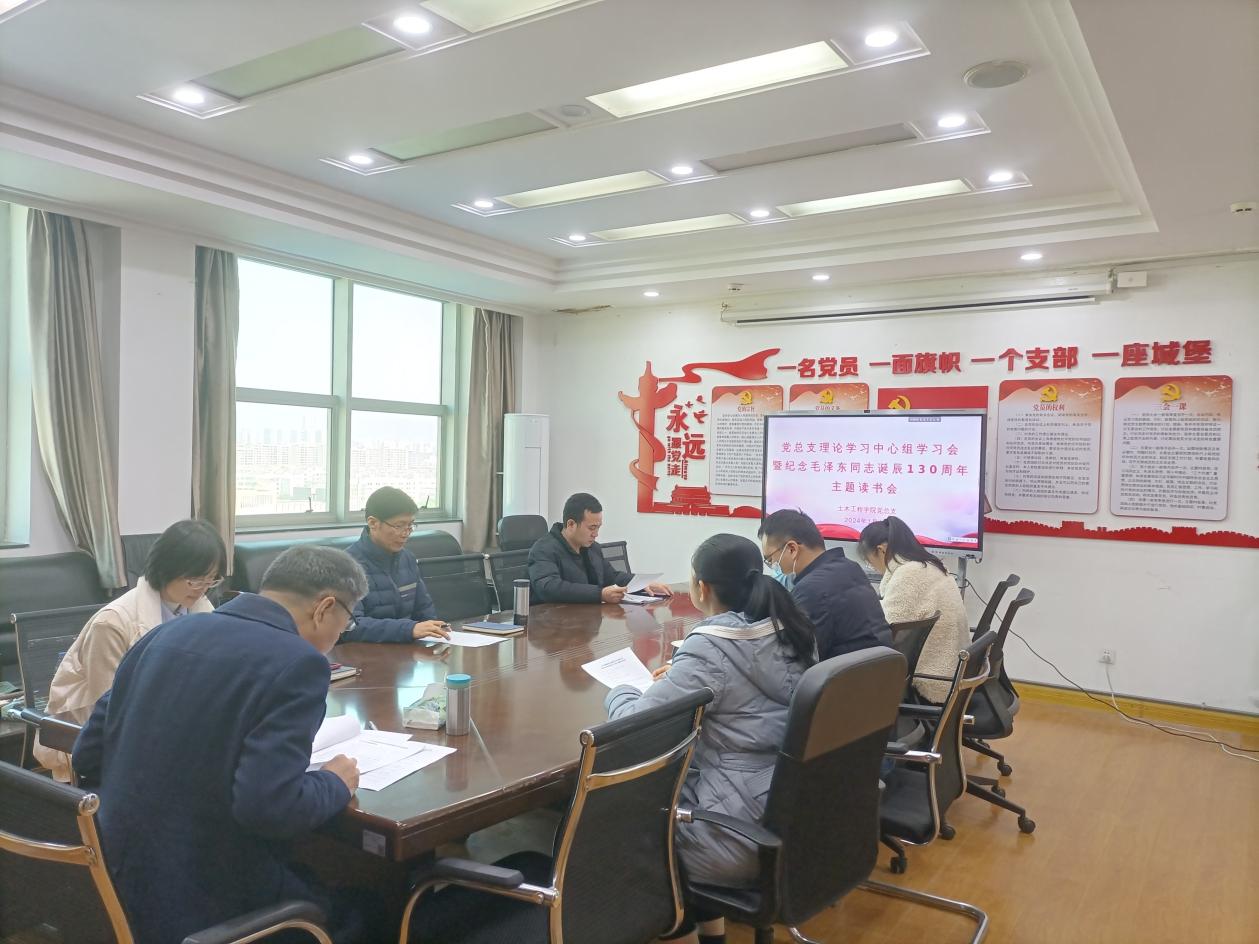 2024年1月4日上午,土木工程學(xué)院在創(chuàng)新樓1009召開(kāi)黨總支理論學(xué)習(xí)中心組學(xué)習(xí)會(huì)暨紀(jì)念毛澤東同志誕辰130周年主題讀書會(huì)。會(huì)上,黨總支書記高杰同志領(lǐng)學(xué)了習(xí)近平在紀(jì)念毛澤東同志誕辰130周年座談會(huì)上發(fā)表的重要講話,與會(huì)成員圍繞“緬懷偉大領(lǐng)袖,砥礪奮進(jìn)前行”主題開(kāi)展讀書活動(dòng),重溫了毛澤東在閩西革命斗爭(zhēng)時(shí)期《中國(guó)共產(chǎn)黨紅軍第四軍第九次代表大會(huì)決議案》《星星之火可以燎原》《反對(duì)本本主義》《才溪鄉(xiāng)調(diào)查》《關(guān)心群眾生活,注意工作方法》5篇重要著作,《清平樂(lè)·蔣桂戰(zhàn)爭(zhēng)》《采桑子·重陽(yáng)》《如夢(mèng)令·元旦》等3首詩(shī)詞。這既是對(duì)毛澤東同志的深切緬懷與紀(jì)念,又是一次回顧黨的光輝歷程、傳承紅色革命精神的思想教育和理論學(xué)習(xí)。