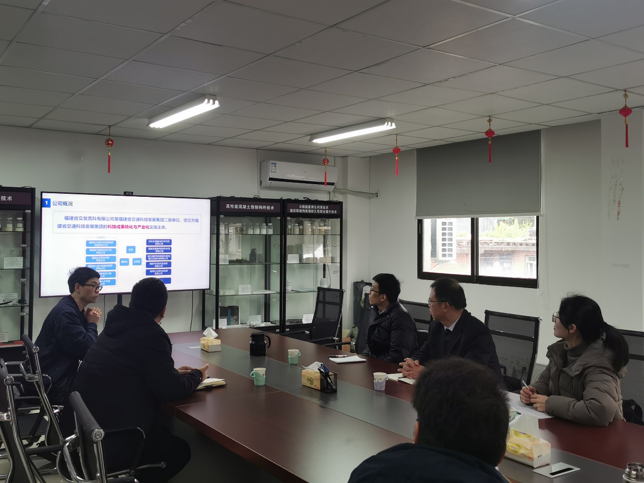 福建省交發(fā)高科有限公司副總經(jīng)理左廣洲對卜力平一行的來訪調(diào)研表示熱烈歡迎。在座談環(huán)節(jié),技術(shù)研發(fā)部部長劉林石水介紹了公司基本情況,發(fā)展歷程以及公司在科技創(chuàng)新研究應(yīng)用方面的最新成果,包括隧道安全低碳建養(yǎng)技術(shù)、低碳環(huán)保型路面建養(yǎng)技術(shù)、海洋環(huán)境構(gòu)筑物耐久性綜合提升技術(shù)、公路固廢再生利用技術(shù)和基于新材料的工業(yè)化建造技術(shù)等。卜力平教授級高級工程師介紹了土木工程學(xué)院近幾年在科研創(chuàng)新和技術(shù)轉(zhuǎn)化方面的成果,以及人才培養(yǎng)、社會培訓(xùn)、實(shí)習(xí)就業(yè)、技術(shù)服務(wù)等方面的特色和亮點(diǎn)。雙方一致認(rèn)為,將秉持互利共贏原則,通過產(chǎn)教融合與校企合作,加強(qiáng)交流溝通,充分發(fā)揮各自領(lǐng)域的專業(yè)技術(shù)優(yōu)勢,實(shí)現(xiàn)校企資源有機(jī)結(jié)合,形成專業(yè)產(chǎn)業(yè)相互促進(jìn)、共同發(fā)展。
