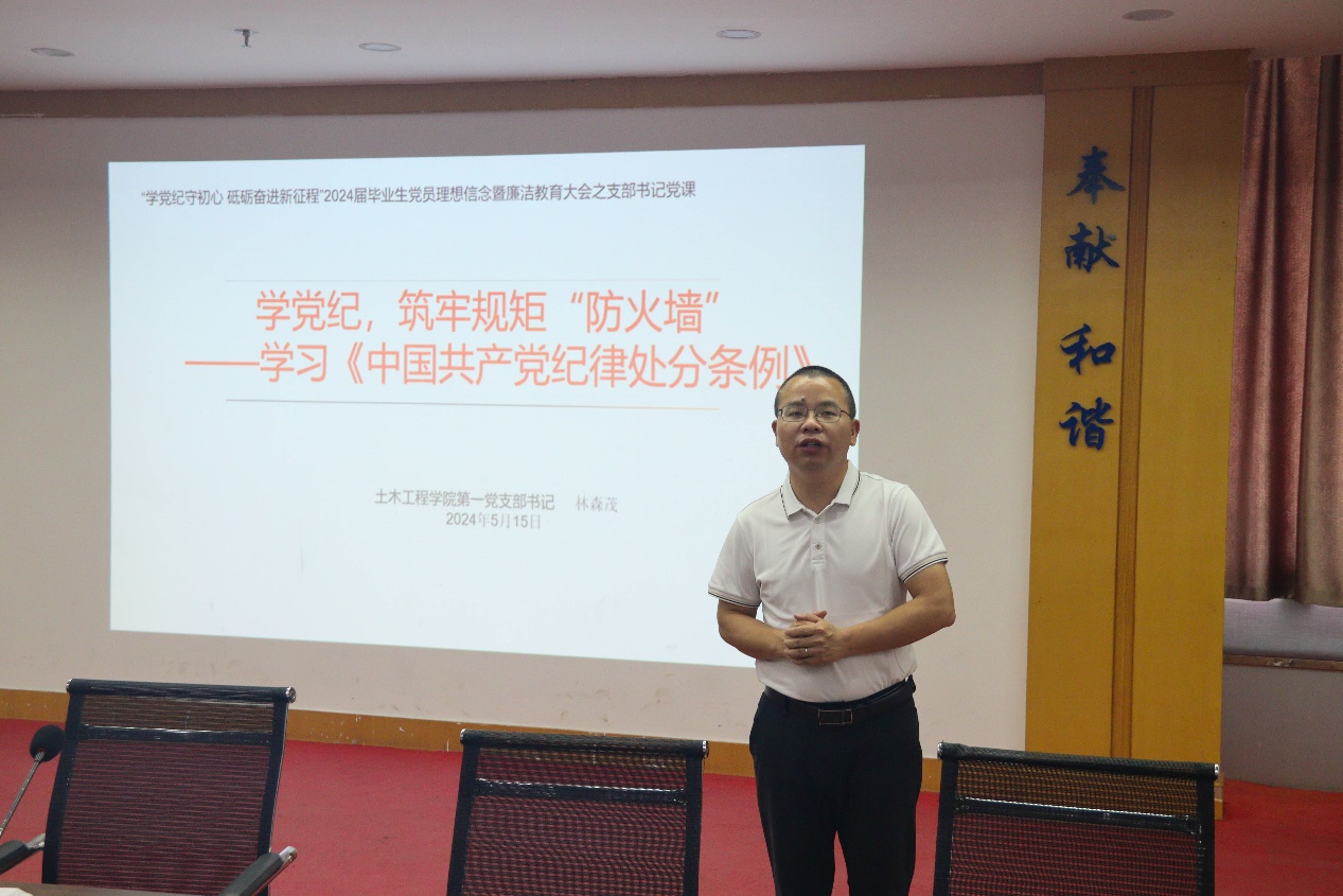 為深入學(xué)習(xí)貫徹習(xí)近平新時(shí)代中國(guó)特色社會(huì)主義思想和黨的二十大精神,推動(dòng)黨史學(xué)習(xí)教育常態(tài)化長(zhǎng)效化,鞏固拓展學(xué)習(xí)貫徹習(xí)近平新時(shí)代中國(guó)特色社會(huì)主義思想主題教育成果,深入實(shí)施“深學(xué)爭(zhēng)優(yōu)、敢為爭(zhēng)先、實(shí)干爭(zhēng)效”行動(dòng),加強(qiáng)畢業(yè)生黨員理想信念,增強(qiáng)廉潔意識(shí)和組織觀念,深刻認(rèn)識(shí)新時(shí)代使命責(zé)任,充分發(fā)揮先鋒模范作用,2024年5月15日,土木工程學(xué)院第一黨支部在福船園創(chuàng)新樓1007號(hào)會(huì)議室舉行“學(xué)黨紀(jì)守初心 砥礪奮進(jìn)新征程”2024屆畢業(yè)生黨員理想信念暨廉潔教育大會(huì)。土木工程學(xué)院第一黨支部全體教師黨員、2024屆畢業(yè)生黨員參加。