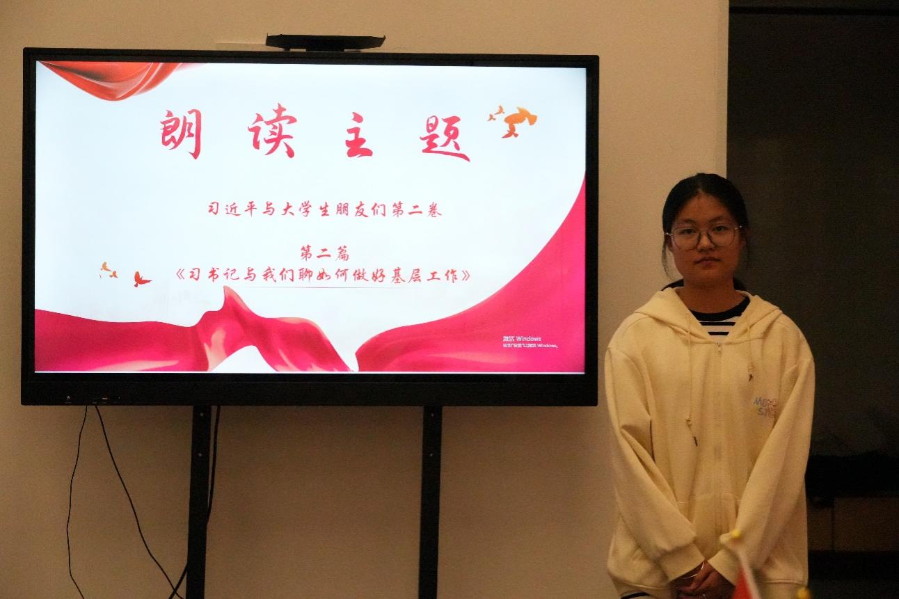 分享會上,2023級建筑裝飾工程技術(shù)2班組織委員柳慧欣,領(lǐng)學(xué)朗讀了,《習(xí)近平與大學(xué)生朋友們》第二卷第二篇《習(xí)書記與我們聊如何做好基層工作》,從中我深切地感受到了習(xí)近平總書記對于基層工作的極度關(guān)注以及他對年輕學(xué)生們的深深關(guān)懷。