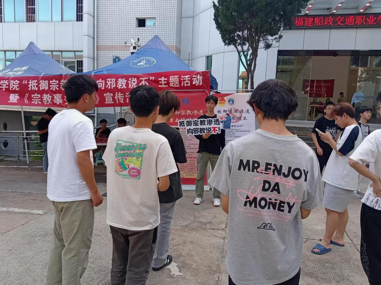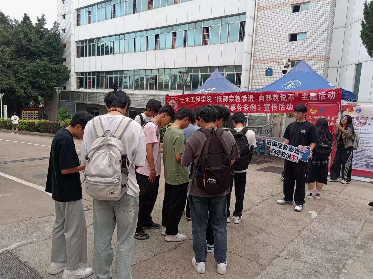 為大力弘揚(yáng)法治正能量,增強(qiáng)學(xué)生反邪教意識(shí),切實(shí)筑牢防范遏制邪教滲透的思想防線,全力維護(hù)平安和諧的校園環(huán)境。2024年10月23日,土木工程學(xué)院于福航園“一站式”學(xué)生社區(qū)開(kāi)展“抵御宗教滲透,向邪教說(shuō)不”主題活動(dòng)暨《宗教事務(wù)條例》宣傳活動(dòng)。