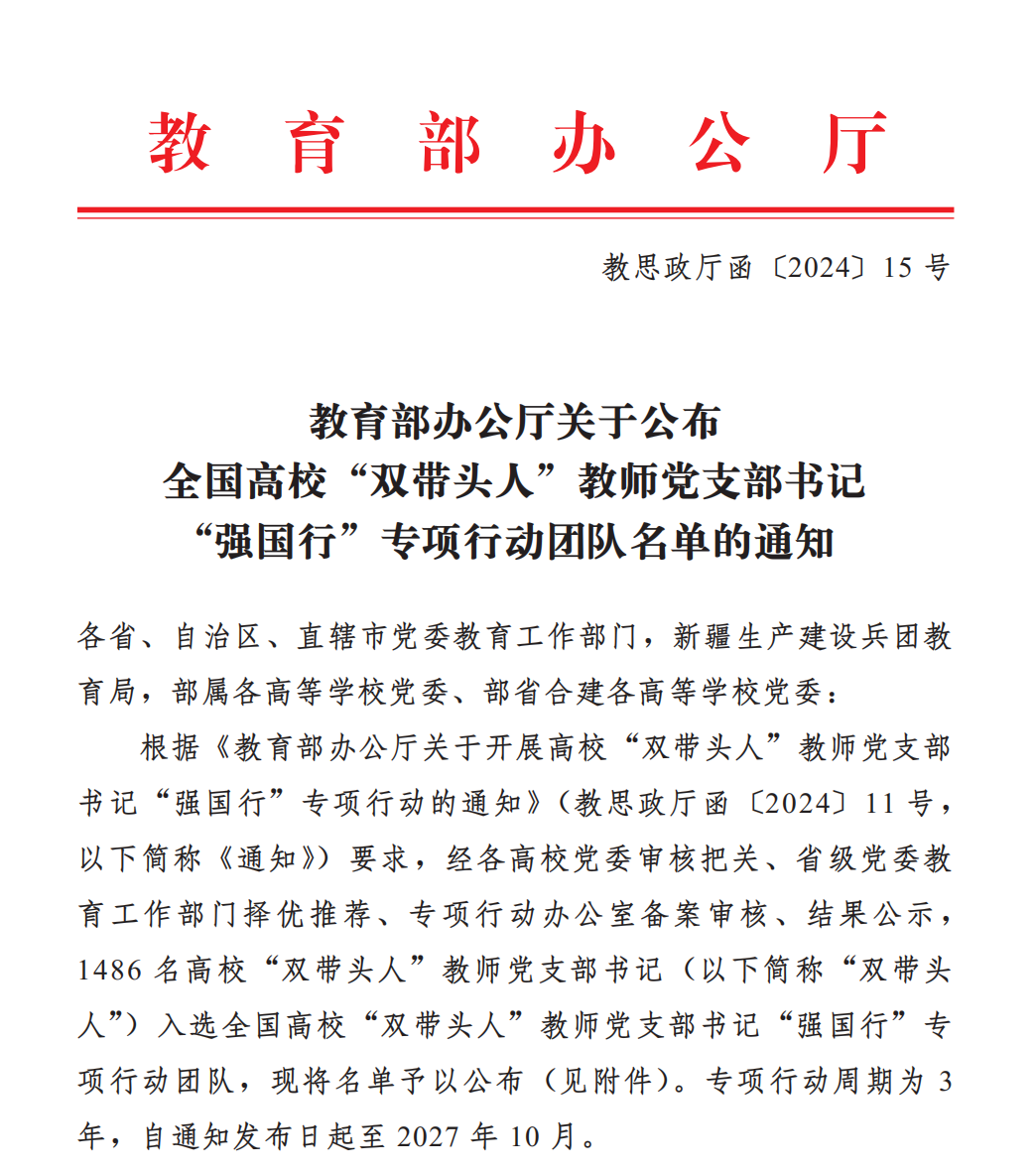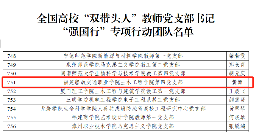 近日,教育部辦公廳公布了全國(guó)高?!半p帶頭人”教師黨支部書(shū)記“強(qiáng)國(guó)行”專(zhuān)項(xiàng)行動(dòng)團(tuán)隊(duì)名單,土木工程學(xué)院第四黨支部(負(fù)責(zé)人:黃穎)入選全國(guó)高?!半p帶頭人”教師黨支部書(shū)記“強(qiáng)國(guó)行”專(zhuān)項(xiàng)行動(dòng)團(tuán)隊(duì)。