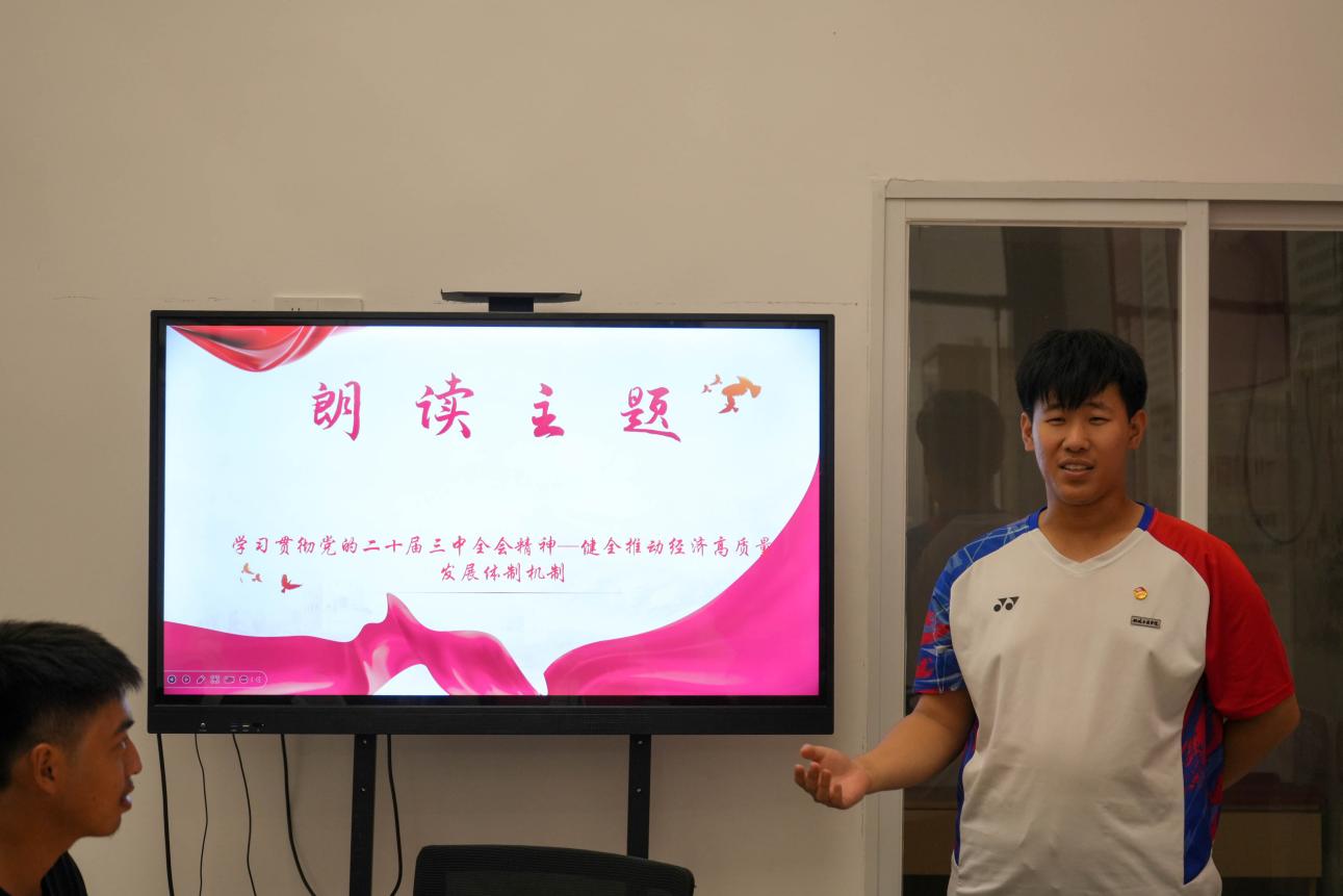 分享會上,2024級建設(shè)工程監(jiān)理1班臨時副班長張忠偉,領(lǐng)學(xué)朗讀了《中共中央關(guān)于進一步全面深化改革、推進中國式現(xiàn)代化的決定》(后文簡稱《決定》)“健全推動經(jīng)濟高質(zhì)量發(fā)展體制機制”部分。
