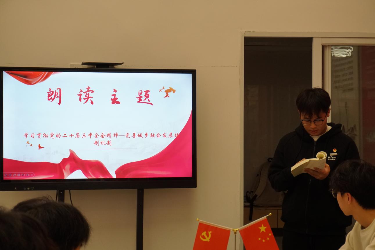 分享會(huì)上,2024級(jí)建筑工程技術(shù)3班班長(zhǎng)江順,土木工程學(xué)院實(shí)踐部成員,領(lǐng)學(xué)朗讀了《中共中央關(guān)于進(jìn)一步全面深化改革、推進(jìn)中國(guó)式現(xiàn)代化的決定》(后文簡(jiǎn)稱《決定》)“完善城鄉(xiāng)融合發(fā)展體制機(jī)制”部分。
