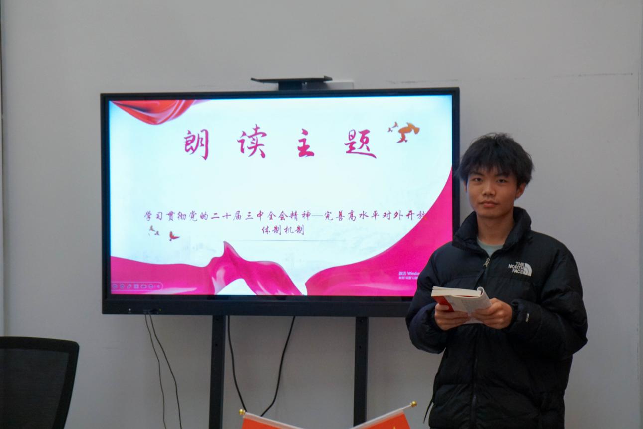 分享會上,2024級道路與橋梁工程技術(shù)1班團(tuán)支書林雨涵,領(lǐng)學(xué)朗讀了《中共中央關(guān)于進(jìn)一步全面深化改革、推進(jìn)中國式現(xiàn)代化的決定》(后文簡稱《決定》)“完善高水平對外開放體制機(jī)制”部分。