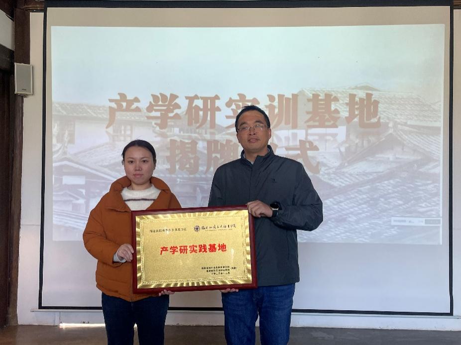 隨后,雙方舉行了簽約儀式與揭牌儀式。永泰縣嵩口鎮(zhèn)組織委員鄢美鳳與土木工程學(xué)院朱明栓副院長代表校地雙方簽署合作協(xié)議,并共同為“產(chǎn)學(xué)研實訓(xùn)基地”揭牌。
