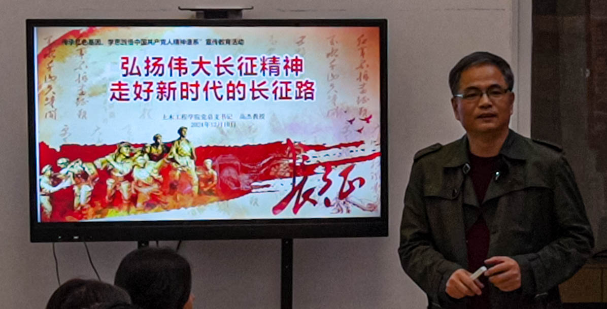 為深入學(xué)習(xí)宣傳貫徹習(xí)近平新時(shí)代中國(guó)特色社會(huì)主義思想和黨的二十屆三中全會(huì)精神,引導(dǎo)青年學(xué)生堅(jiān)定馬克思主義信仰、中國(guó)特色社會(huì)主義信念、中華民族偉大復(fù)興信心,深刻領(lǐng)悟中國(guó)共產(chǎn)黨人精神譜系的豐富內(nèi)涵和時(shí)代意義,傳承紅色基因,賡續(xù)紅色血脈,2024年12月10日下午,土木工程學(xué)院黨總支書記高杰教授在福航園“一站式”學(xué)生社區(qū)思政引領(lǐng)室以“弘揚(yáng)偉大長(zhǎng)征精神,走好新時(shí)代的長(zhǎng)征路”為題給青年學(xué)生上形勢(shì)與政策課暨專題思政課。
