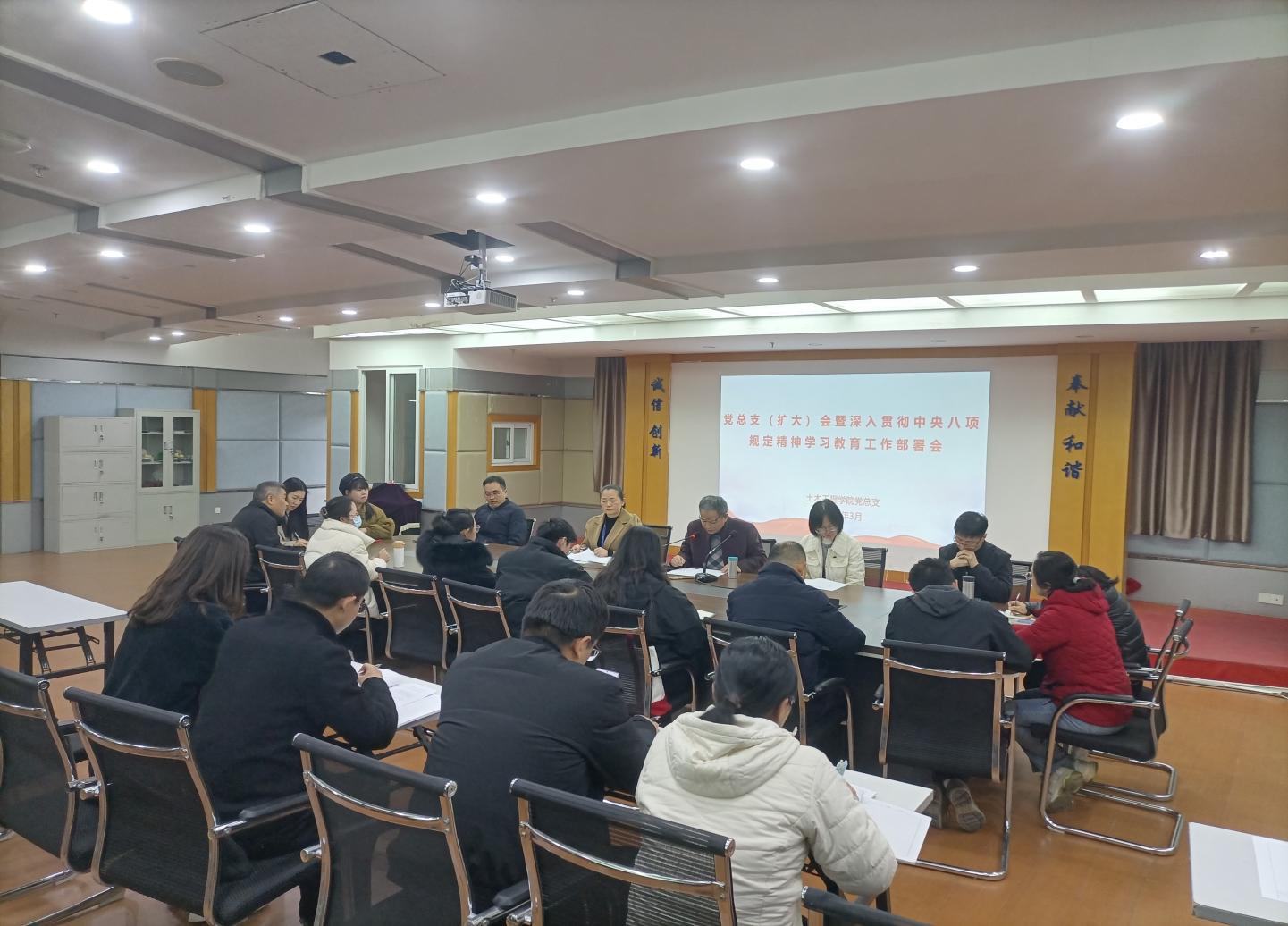 3月31日,土木工程學(xué)院黨總支召開(kāi)黨總支(擴(kuò)大)會(huì)暨深入貫徹中央八項(xiàng)規(guī)定精神學(xué)習(xí)教育工作部署會(huì),傳達(dá)學(xué)習(xí)習(xí)近平總書記關(guān)于深入貫徹中央八項(xiàng)規(guī)定精神學(xué)習(xí)教育的重要講話和重要指示精神,中央黨的建設(shè)工作領(lǐng)導(dǎo)小組會(huì)議精神、省委黨的建設(shè)工作領(lǐng)導(dǎo)小組會(huì)議精神、學(xué)校黨委會(huì)精神,研究部署學(xué)院學(xué)習(xí)教育工作。領(lǐng)導(dǎo)班子成員、副科級(jí)及以上干部、黨支部書記、副書記參加會(huì)議。會(huì)議由黨總支書記高杰同志主持。