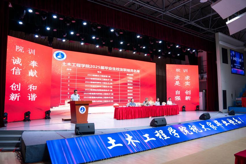 2025年6月10日,土木工程學(xué)院在福道園文體中心隆重舉行2025屆畢業(yè)生畢業(yè)典禮。作為典禮重要環(huán)節(jié),土木工程專業(yè)委員會(huì)正式聘任22名2025屆畢業(yè)生擔(dān)任校友聯(lián)絡(luò)員,建立校友與母校的常態(tài)化聯(lián)絡(luò)機(jī)制。學(xué)院黨總支書記高杰、院長(zhǎng)黃穎等領(lǐng)導(dǎo)班子成員、部分教師代表及2025屆全體畢業(yè)生共同見證這一重要時(shí)刻。