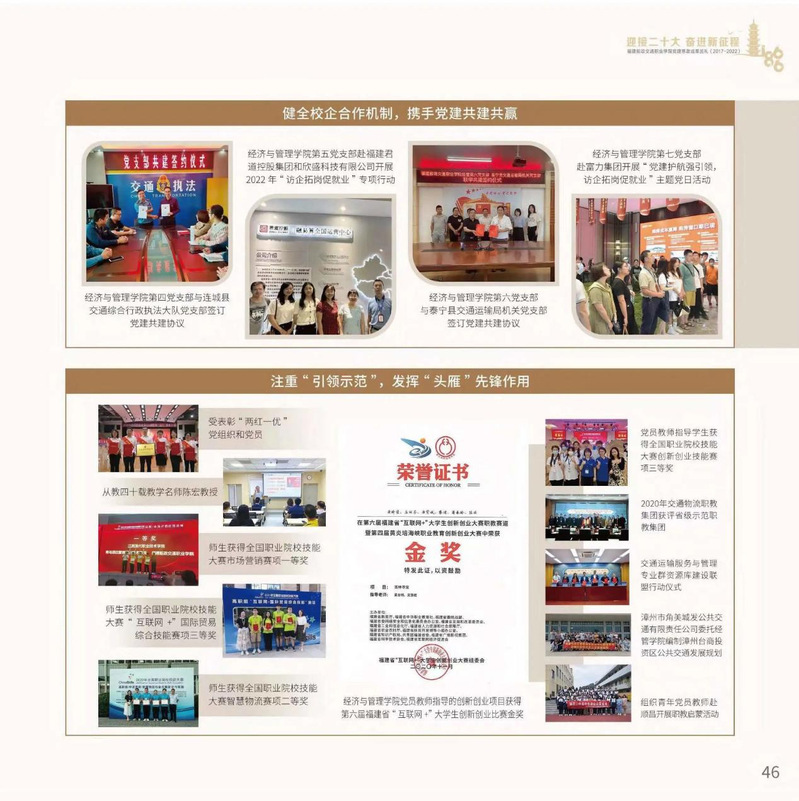 十九大以來,福建船政交通職業(yè)學(xué)院堅持以習(xí)近平新時代中國特色社會主義思想為指導(dǎo),堅持社會主義辦學(xué)方向,深入貫徹黨的十九大和十九屆歷次全會精神,堅守“為黨育人、為國育才”的初心和使命,慎終如始推進(jìn)學(xué)校黨的政治建設(shè)、思想建設(shè)、組織建設(shè)、作風(fēng)建設(shè)、紀(jì)律建設(shè)、制度建設(shè),黨的組織體系和學(xué)校治理體系相得益彰,黨建引領(lǐng)推動創(chuàng)新船政、質(zhì)量船政、文化船政協(xié)奏齊鳴,政治生態(tài)、學(xué)術(shù)生態(tài)、文化生態(tài)持續(xù)向好,辦學(xué)效率、辦學(xué)效能、辦學(xué)效益顯著提升!