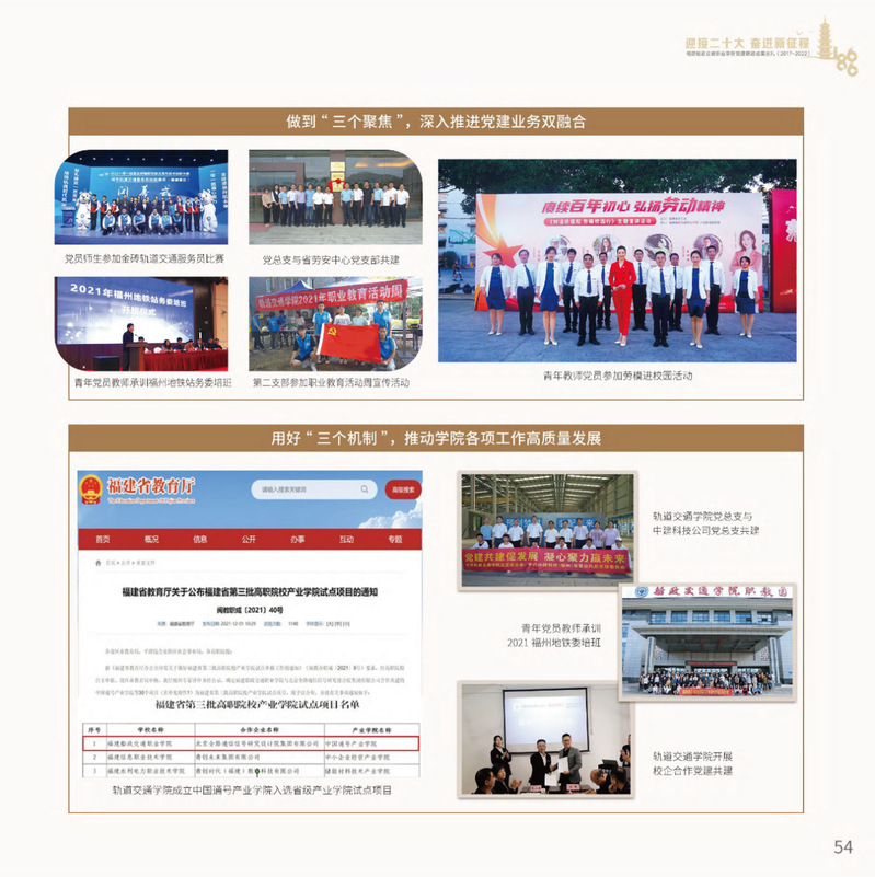 十九大以來,福建船政交通職業(yè)學(xué)院堅(jiān)持以習(xí)近平新時(shí)代中國(guó)特色社會(huì)主義思想為指導(dǎo),堅(jiān)持社會(huì)主義辦學(xué)方向,深入貫徹黨的十九大和十九屆歷次全會(huì)精神,堅(jiān)守“為黨育人、為國(guó)育才”的初心和使命,慎終如始推進(jìn)學(xué)校黨的政治建設(shè)、思想建設(shè)、組織建設(shè)、作風(fēng)建設(shè)、紀(jì)律建設(shè)、制度建設(shè),黨的組織體系和學(xué)校治理體系相得益彰,黨建引領(lǐng)推動(dòng)創(chuàng)新船政、質(zhì)量船政、文化船政協(xié)奏齊鳴,政治生態(tài)、學(xué)術(shù)生態(tài)、文化生態(tài)持續(xù)向好,辦學(xué)效率、辦學(xué)效能、辦學(xué)效益顯著提升!