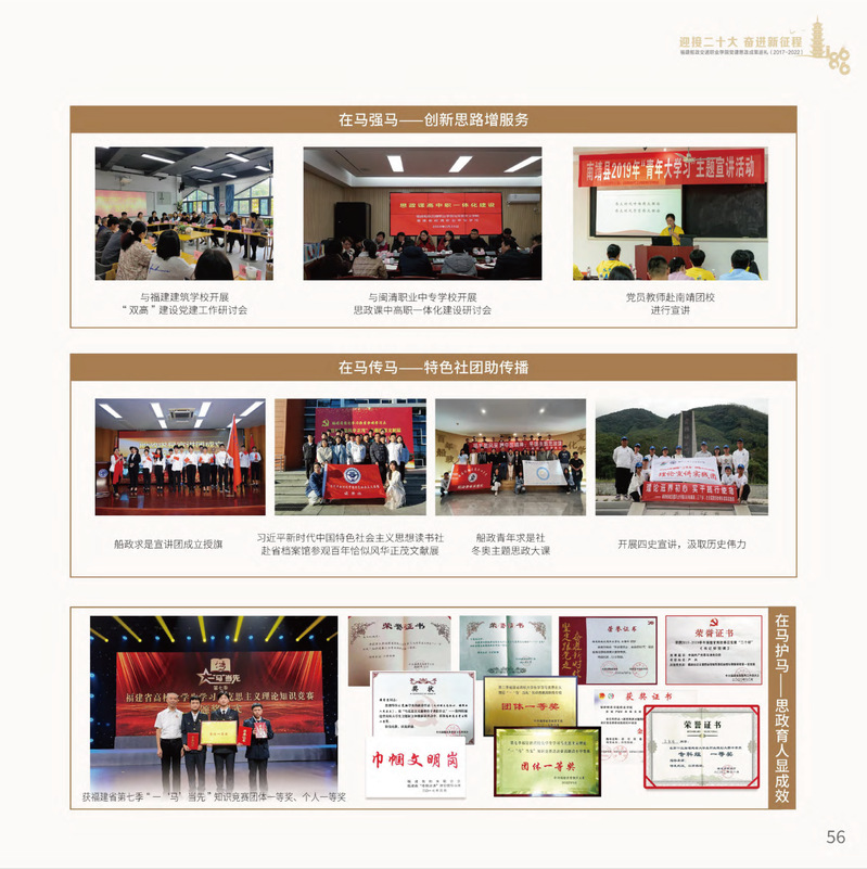 十九大以來,福建船政交通職業(yè)學(xué)院堅持以習(xí)近平新時代中國特色社會主義思想為指導(dǎo),堅持社會主義辦學(xué)方向,深入貫徹黨的十九大和十九屆歷次全會精神,堅守“為黨育人、為國育才”的初心和使命,慎終如始推進學(xué)校黨的政治建設(shè)、思想建設(shè)、組織建設(shè)、作風(fēng)建設(shè)、紀(jì)律建設(shè)、制度建設(shè),黨的組織體系和學(xué)校治理體系相得益彰,黨建引領(lǐng)推動創(chuàng)新船政、質(zhì)量船政、文化船政協(xié)奏齊鳴,政治生態(tài)、學(xué)術(shù)生態(tài)、文化生態(tài)持續(xù)向好,辦學(xué)效率、辦學(xué)效能、辦學(xué)效益顯著提升!