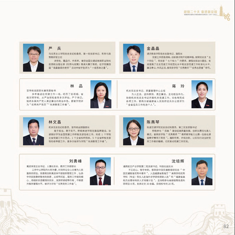 2022年是黨的二十大召開之年,是學(xué)校深化綜合改革、加快“雙高”建設(shè)的關(guān)鍵年,是續(xù)寫過去5年工作、回首新時代10年變革的轉(zhuǎn)折年。站在新的歷史起點上,船政交通人將始終沿著習(xí)近平總書記親自為福建擘畫的最美山水圖、沿革船政先賢留下的文化瑰寶、延續(xù)一代代船政交通人接續(xù)奮斗的精神,以飽滿的精神、昂揚(yáng)的斗志、奮進(jìn)的狀態(tài),開啟建設(shè)中國特色高水平高職學(xué)校的新征程,以優(yōu)異成績慶祝黨的二十大勝利召開!
