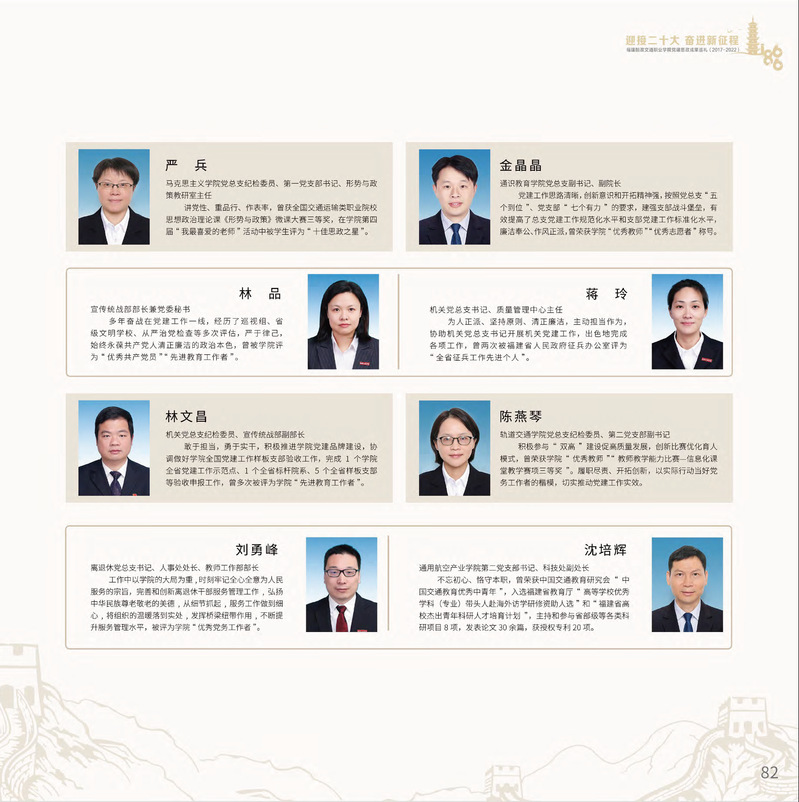 十九大以來,福建船政交通職業(yè)學(xué)院堅持以習(xí)近平新時代中國特色社會主義思想為指導(dǎo),堅持社會主義辦學(xué)方向,深入貫徹黨的十九大和十九屆歷次全會精神,堅守“為黨育人、為國育才”的初心和使命,慎終如始推進(jìn)學(xué)校黨的政治建設(shè)、思想建設(shè)、組織建設(shè)、作風(fēng)建設(shè)、紀(jì)律建設(shè)、制度建設(shè),黨的組織體系和學(xué)校治理體系相得益彰,黨建引領(lǐng)推動創(chuàng)新船政、質(zhì)量船政、文化船政協(xié)奏齊鳴,政治生態(tài)、學(xué)術(shù)生態(tài)、文化生態(tài)持續(xù)向好,辦學(xué)效率、辦學(xué)效能、辦學(xué)效益顯著提升! 近期,學(xué)校官微將陸續(xù)推出“學(xué)校黨建思政成果巡禮(2017-2022)”專題系列,邀請您共同回顧學(xué)校過去五年黨建思政工作的發(fā)展歷程。 感召榜樣力量