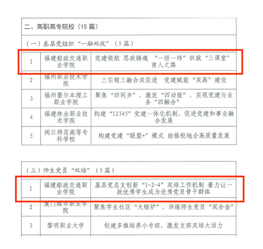 近日,省委教育工委公布全省高?!耙蝗陔p優(yōu)”基層黨建工作模式典型案例入選名單。我院黨委選送的《黨建領(lǐng)航 思政鑄魂“一經(jīng)一緯”織就“三課堂”育人之路》入選高職高專組基層黨組織“一融雙優(yōu)”工作案例,《基層黨總支創(chuàng)新“1-2-4”雙培工作機(jī)制 著力讓一批優(yōu)秀學(xué)生成為優(yōu)秀黨員骨干群體》入選高職高專組師生黨員“雙培”工作案例。