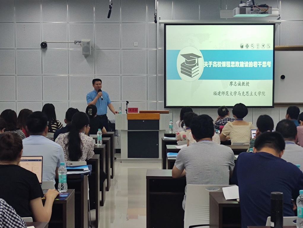福建師范大學(xué)馬克思主義學(xué)院教授、法學(xué)博士、碩導(dǎo)、思想政治教育專業(yè)碩士點(diǎn)學(xué)科帶頭人廖志誠(chéng)以《關(guān)于高校課程思政的若干思考》為題,為大家厘清了課程思政的內(nèi)涵釋義,闡明了高校課程思政建設(shè)的重要意義,指引學(xué)員們?nèi)绾纬浞职l(fā)揮課程思政的育人作用,并做課程思政的課例實(shí)踐展示。
