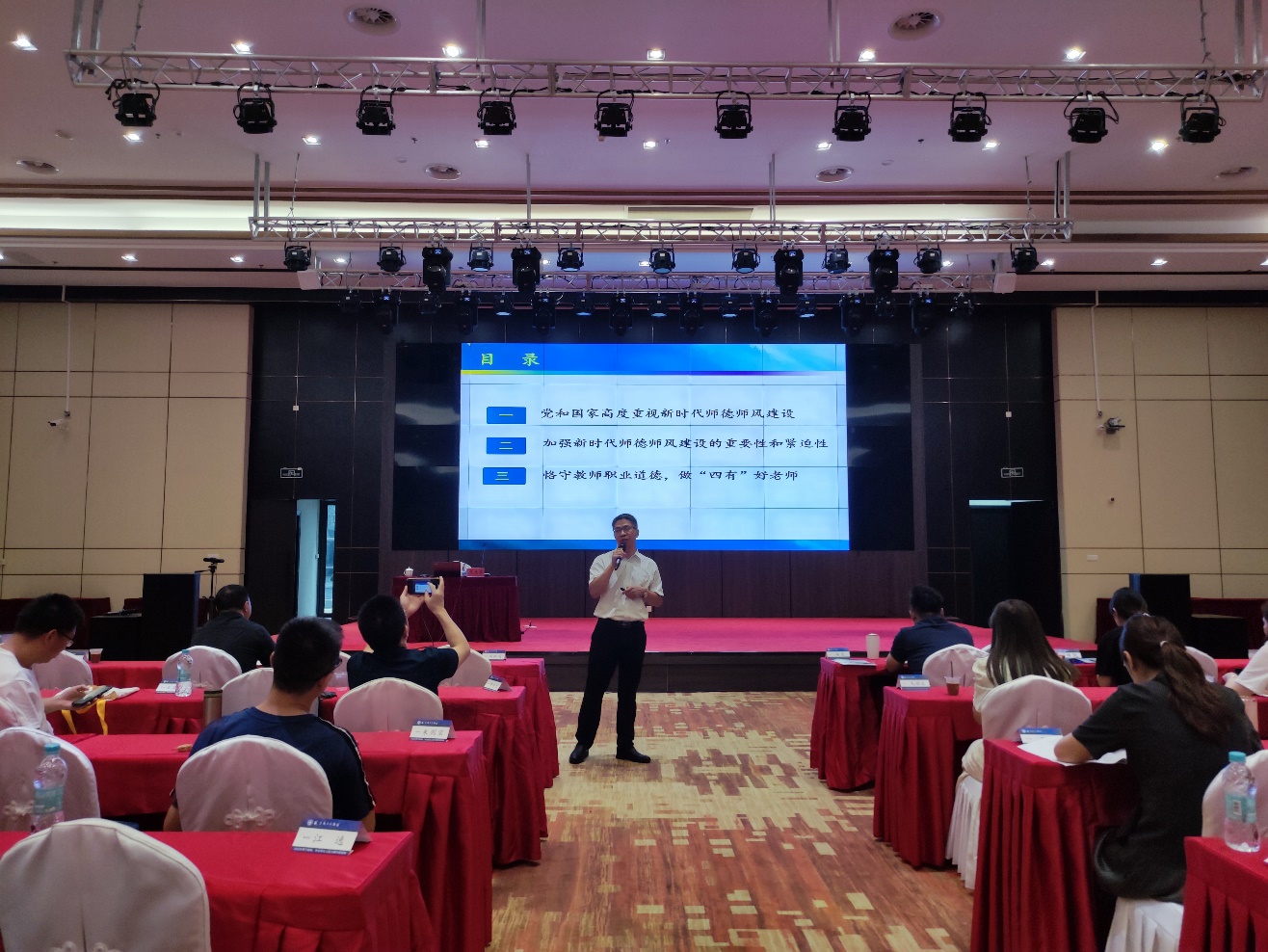 福建教育學(xué)院黨委宣傳部部長(zhǎng) 、福建省教工委教育廳師德師風(fēng)大講堂講師團(tuán)成員、福建省第二批名師名校長(zhǎng)培養(yǎng)人選導(dǎo)師團(tuán)成員范光基研究員做題為“恪守職業(yè)道德,做‘四有’好老師”專題講座,以大量實(shí)例分析了在黨和國(guó)家高度重視新時(shí)代師德師風(fēng)建設(shè)背景下,加強(qiáng)新時(shí)代師德師風(fēng)建設(shè)的重要性和緊迫性,指引學(xué)員們要恪守教師職業(yè)道德,做“四有”好老師。