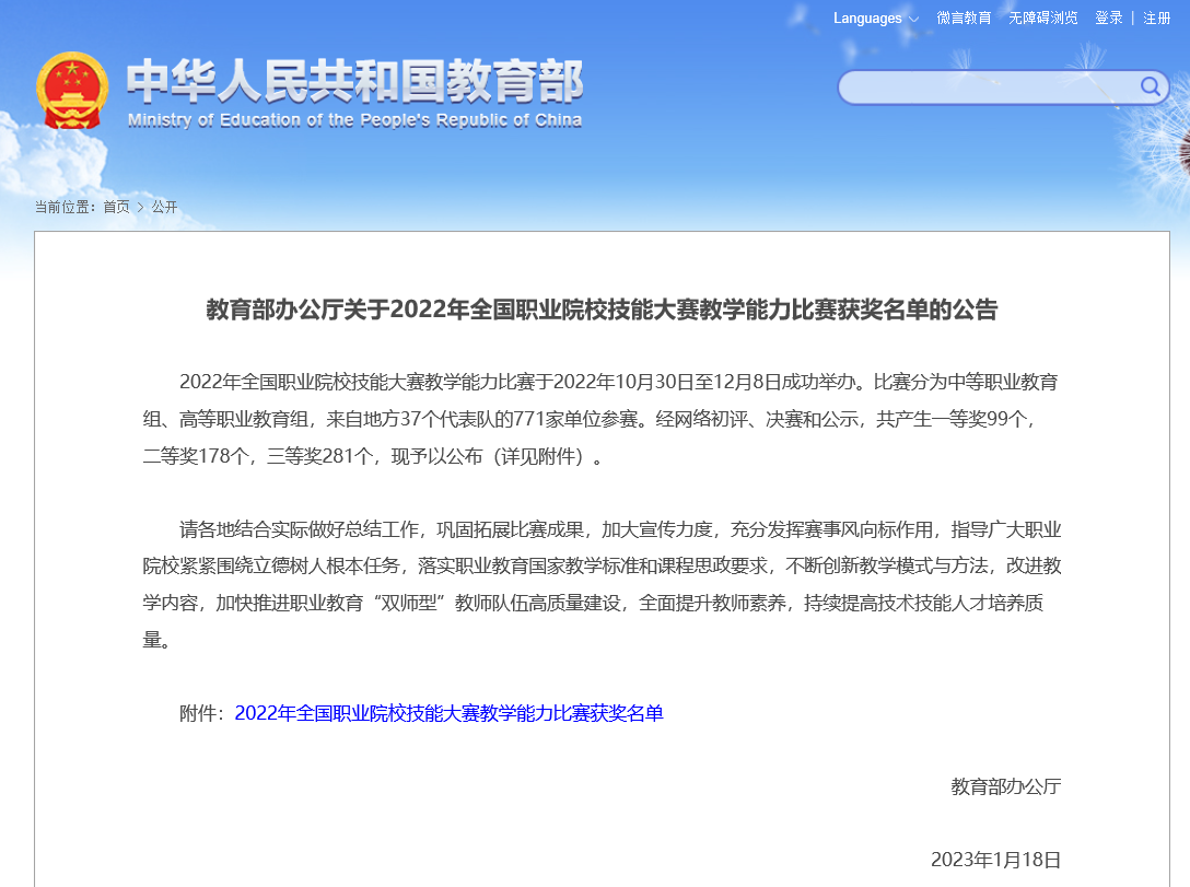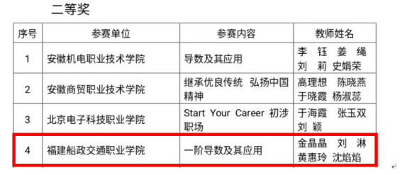 2023年1月18日,教育部辦公廳公布由教育部主辦,代表全國(guó)職業(yè)院校教學(xué)能力最高水平的權(quán)威賽事--2022年全國(guó)職業(yè)院校技能大賽教學(xué)能力比賽獲獎(jiǎng)名單。我校通識(shí)教育學(xué)院金晶晶、劉淋、黃惠玲、沈焰焰教學(xué)團(tuán)隊(duì)的作品《一階導(dǎo)數(shù)及其應(yīng)用》榮獲二等獎(jiǎng)。