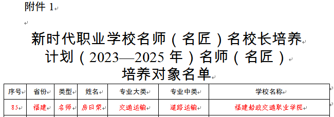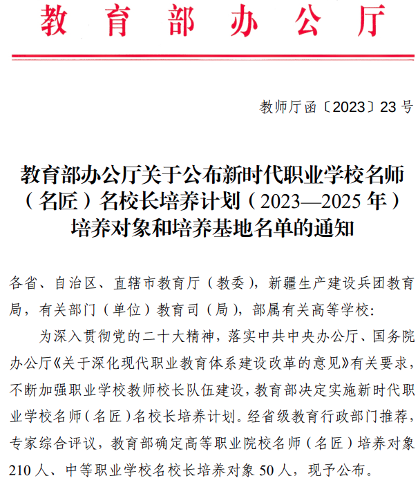 近日,教育部辦公廳下發(fā)《關(guān)于公布新時代職業(yè)學(xué)校名師(名匠)名校長培養(yǎng)計(jì)劃(2023—2025年)培養(yǎng)對象和培養(yǎng)基地名單的通知》,確定高等職業(yè)院校名師(名匠)培養(yǎng)對象210人、中等職業(yè)學(xué)校名校長培養(yǎng)對象50人。我院房曰榮教授入選為高等職業(yè)院校名師培養(yǎng)對象。