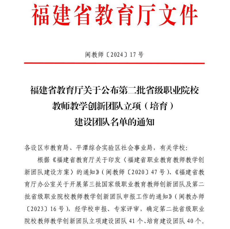 近日,福建省教育廳印發(fā)《關(guān)于公布第二批省級職業(yè)院校教師教學(xué)創(chuàng)新團(tuán)隊(duì)立項(xiàng)(培育)建設(shè)團(tuán)隊(duì)名單的通知》,確定第二批省級職業(yè)院校教師教學(xué)創(chuàng)新團(tuán)隊(duì)立項(xiàng)建設(shè)團(tuán)隊(duì)41個(gè)、培育建設(shè)團(tuán)隊(duì)40個(gè)。我院船舶工程技術(shù)、新能源汽車技術(shù)、道路與橋梁工程技術(shù)等三個(gè)團(tuán)隊(duì)入選省級職業(yè)院校教師教學(xué)創(chuàng)新團(tuán)隊(duì)立項(xiàng)建設(shè)團(tuán)隊(duì)。