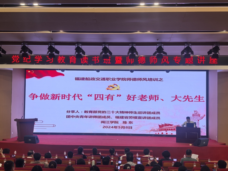 5月8日,學(xué)院黨委舉辦黨紀(jì)學(xué)習(xí)教育讀書班暨師德師風(fēng)專題講座,全院副科級及以上干部,支部書記、副書記,組織員等參加了學(xué)習(xí)。