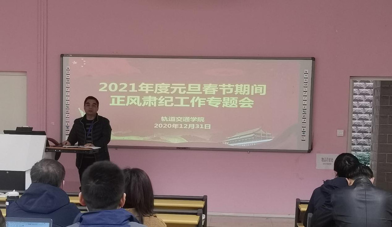 根據(jù)省委辦公廳、省政府辦公廳《關(guān)于做好2021年元旦春節(jié)期間有關(guān)工作的通知》和省紀(jì)委監(jiān)委有關(guān)工作要求以及學(xué)院紀(jì)委《關(guān)于做好2021年元旦春節(jié)期間正風(fēng)肅紀(jì)工作的通知》的相關(guān)規(guī)定,為統(tǒng)籌做好新冠肺炎疫情防控和節(jié)日期間正風(fēng)肅紀(jì)工作,確保元旦春節(jié)期間風(fēng)清氣正,2020年12月31日,軌道交通學(xué)院在北區(qū)二號(hào)樓1-3多媒體教室召開(kāi)2021年度元旦春節(jié)期間正風(fēng)肅紀(jì)工作專(zhuān)題會(huì)。軌道交通學(xué)院黨政領(lǐng)導(dǎo)班子、全院教職工參加會(huì)議,會(huì)議由孫基書(shū)記主持。