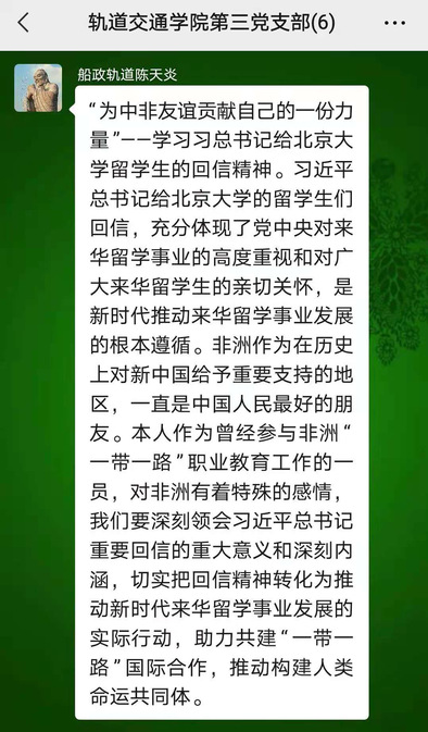 軌道交通學(xué)院院長(zhǎng)陳天炎:“為中非友誼貢獻(xiàn)自己的一份力量”——學(xué)習(xí)習(xí)近平總書記給北京大學(xué)留學(xué)生的回信精神。習(xí)近平總書記給北京大學(xué)的留學(xué)生們回信,充分體現(xiàn)了黨中央對(duì)來華留學(xué)事業(yè)的高度重視和對(duì)廣大來華留學(xué)生的親切關(guān)懷,是新時(shí)代推動(dòng)來華留學(xué)事業(yè)發(fā)展的根本遵循。非洲作為在歷史上對(duì)新中國(guó)給予重要支持的地區(qū),一直是中國(guó)人民最好的朋友。本人作為曾經(jīng)參與非洲“一帶一路”職業(yè)教育工作的一員,對(duì)非洲有著特殊的感情,我們要深刻領(lǐng)會(huì)習(xí)近平總書記重要回信的重大意義和深刻內(nèi)涵,切實(shí)把回信精神轉(zhuǎn)化為推動(dòng)新時(shí)代來華留學(xué)事業(yè)發(fā)展的實(shí)際行動(dòng),助力共建“一帶一路”國(guó)際合作,推動(dòng)構(gòu)建人類命運(yùn)共同體。