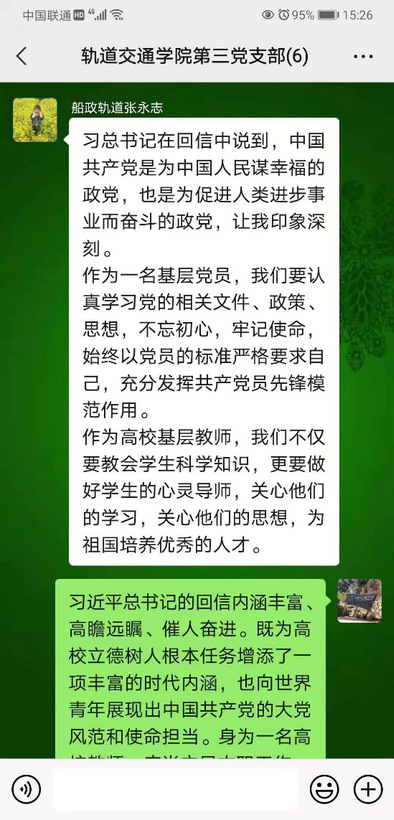2019級(jí)城市軌道交通運(yùn)營(yíng)管理1班林舒婷:讀習(xí)近平總書記給北大留學(xué)生的回信,其中印象讓我深刻的是中國(guó)共產(chǎn)黨致力于發(fā)展經(jīng)濟(jì)、消除貧困,積極援助其他國(guó)家抗擊新冠肺炎疫情。中國(guó)共產(chǎn)黨做這些事情,是因?yàn)橹袊?guó)共產(chǎn)黨是為中國(guó)人民謀幸福的政黨,也是為促進(jìn)人類進(jìn)步事業(yè)而奮斗的政黨。也正是中國(guó)共產(chǎn)黨我們祖國(guó)現(xiàn)如今繁榮昌盛,我們作為中國(guó)的大學(xué)生要跟黨走,做有利于人民的事,現(xiàn)在更是要好好學(xué)習(xí)天天向上!