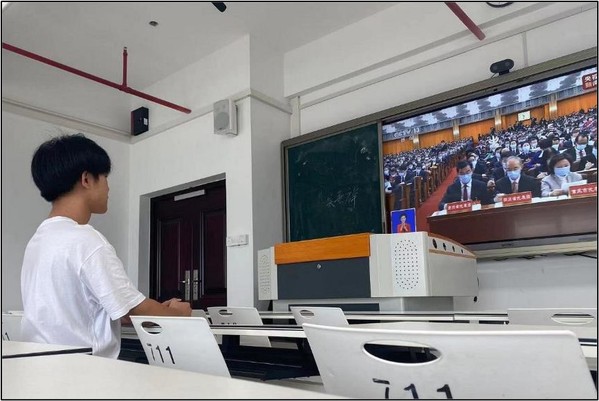 學(xué)院教職工在南區(qū)新實訓(xùn)大樓南樓709教室觀看直播