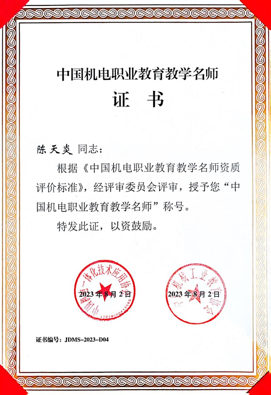 近日,中國機(jī)電一體化技術(shù)應(yīng)用協(xié)會(國家一級協(xié)會)、中國機(jī)械工業(yè)教育協(xié)會(國家一級行業(yè)協(xié)會)聯(lián)合發(fā)布通報,公布2023年中國機(jī)電職業(yè)教育教學(xué)名師名單,福建船政交通職業(yè)學(xué)院軌道交通學(xué)院院長陳天炎老師榮獲“中國機(jī)電職業(yè)教育教學(xué)名師”稱號,表彰其在全國機(jī)電職業(yè)教育領(lǐng)域做出了突出貢獻(xiàn)。