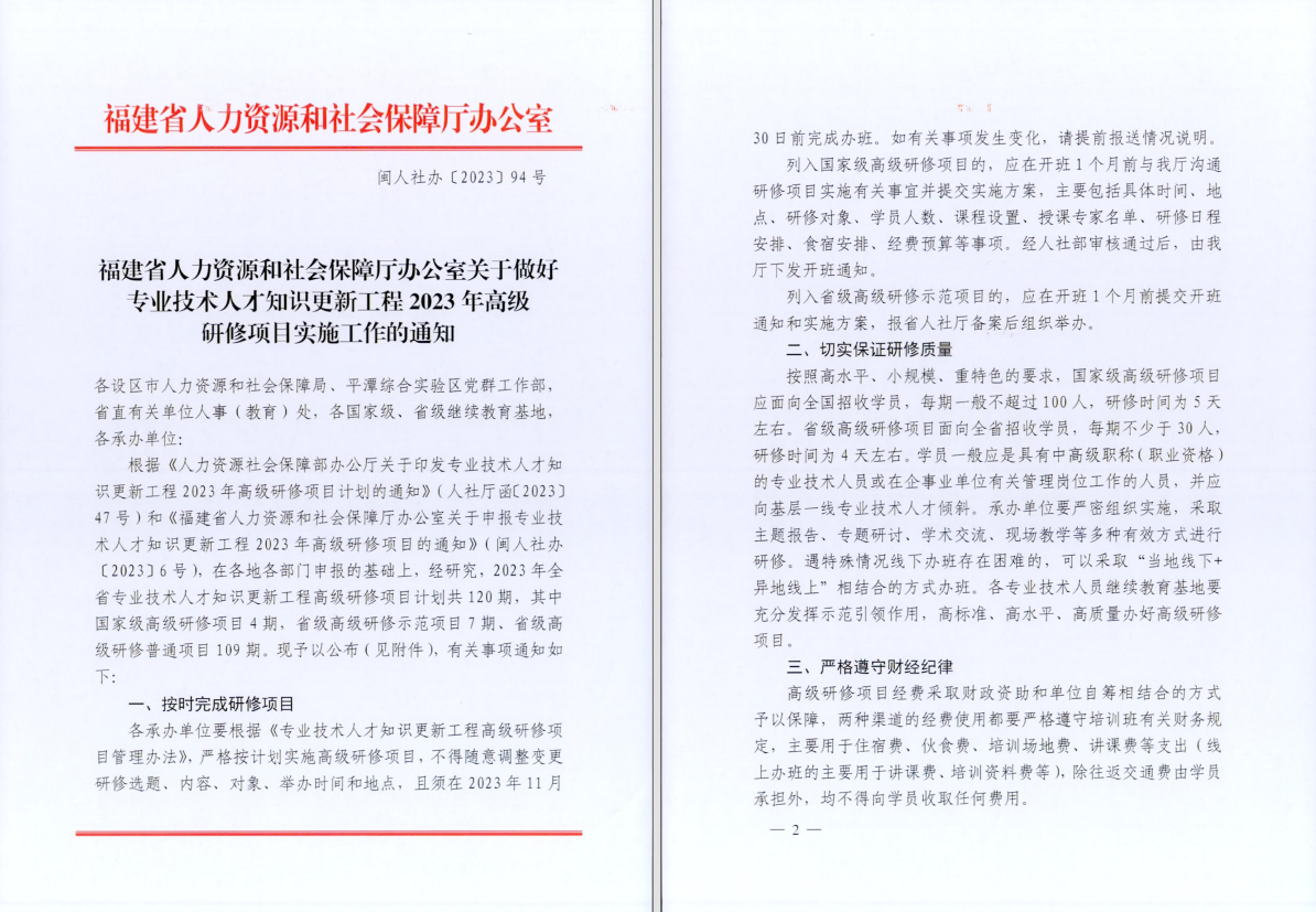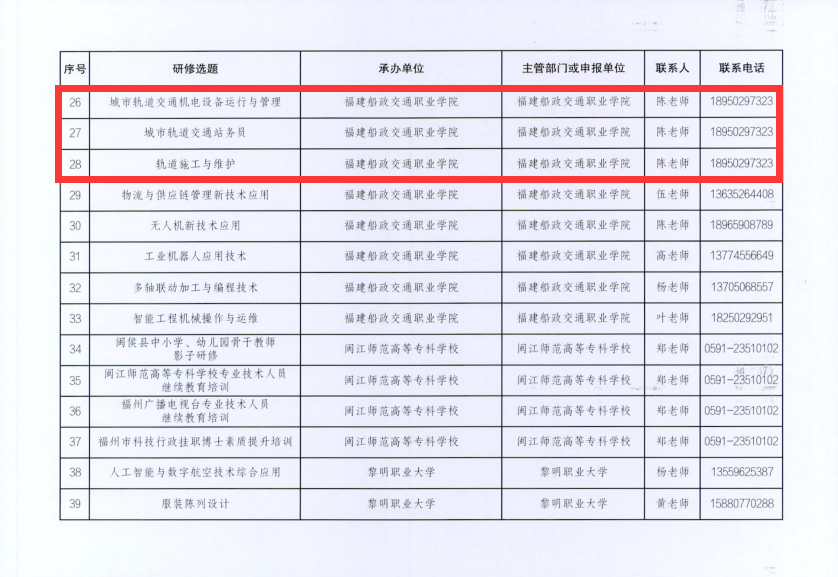 近日,福建省人力資源和社會保障廳辦公室發(fā)布了《關(guān)于做好專業(yè)技術(shù)人才知識更新工程2023年高級研修項(xiàng)目實(shí)施工作的通知》(閩人社辦〔2023〕94號)公布了2023年全省專業(yè)技術(shù)人才知識更新工程高級研修項(xiàng)目計(jì)劃。我院申報(bào)的《城市軌道交通機(jī)電設(shè)備運(yùn)行與管理》等3個(gè)項(xiàng)目成功獲批省級項(xiàng)目。
