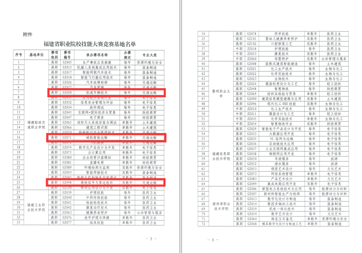 近日,根據(jù)福建省職業(yè)院校技能大賽組委會(huì)《關(guān)于公布福建省職業(yè)院校技能大賽競賽基地的通知》,我院獲批福建省職業(yè)院校技能大賽3個(gè)賽項(xiàng)競賽基地。競賽基地分別承擔(dān)我省軌道車輛技術(shù)(GZ028)、城軌智能運(yùn)輸(GZ071)、高鐵信號與客運(yùn)組織(GZ098)等3個(gè)賽項(xiàng)的組織實(shí)施工作。競賽基地是今后35年省職業(yè)院校技能大賽賽項(xiàng)固定賽點(diǎn)。