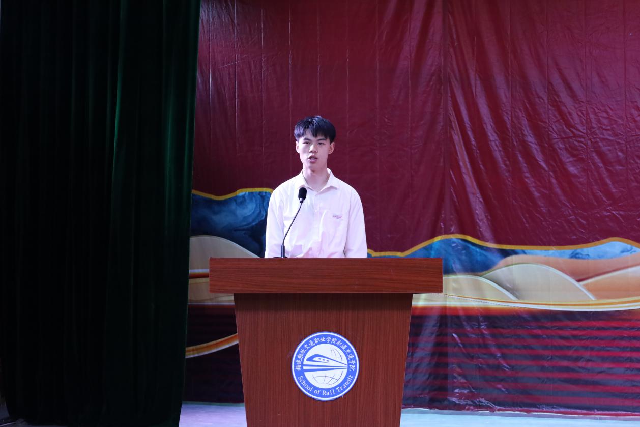 接下來,由軌道交通學(xué)院老生代表黃恒攀發(fā)言,與大家分享了一些自己的感悟:站在大學(xué)這一新的起點(diǎn),希望同學(xué)們能盡快制定適合自己的學(xué)業(yè)規(guī)劃和目標(biāo)并為之努力,同時(shí),黃恒攀同學(xué)也和大家分享了自己在學(xué)院學(xué)生會(huì)與社團(tuán)中的經(jīng)歷,鼓勵(lì)同學(xué)們多去探索自身無限的可能性,去做更多有益的嘗試;最后,黃恒攀同學(xué)祝愿同學(xué)們用實(shí)踐擦亮青春底色,踐行“知常、守正、協(xié)同、精進(jìn)”的院訓(xùn),成長為引領(lǐng)未來的時(shí)代新人。