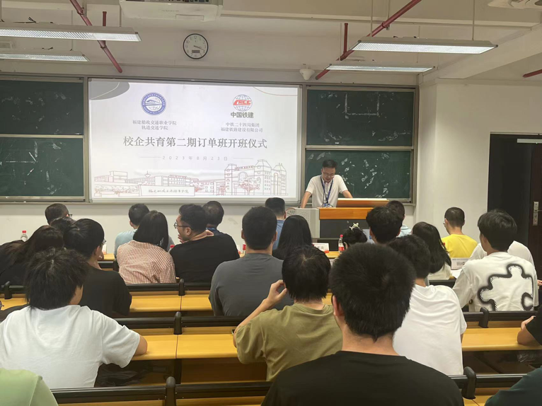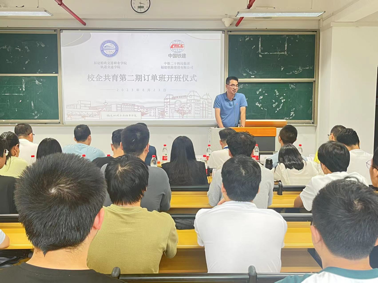 為了進(jìn)一步深化校企合作,加強(qiáng)校企互動,提高“訂單班”對企業(yè)的認(rèn)同感和歸屬感,打造從“招生—入學(xué)—教學(xué)—實(shí)習(xí)—就業(yè)”深度的校企合作,8月23日,福建船政交通職業(yè)學(xué)院軌道交通學(xué)院與中鐵二十四局集團(tuán)福建鐵路建設(shè)有限公司校企共育第二期訂單班開班儀式在我院成功舉辦。企業(yè)人力資源部蔡許昌部長、王燁副部長,學(xué)院孫基書記、陳天炎院長、陳宏意副院長以及軌道交通學(xué)院骨干教師出席本次開班儀式。