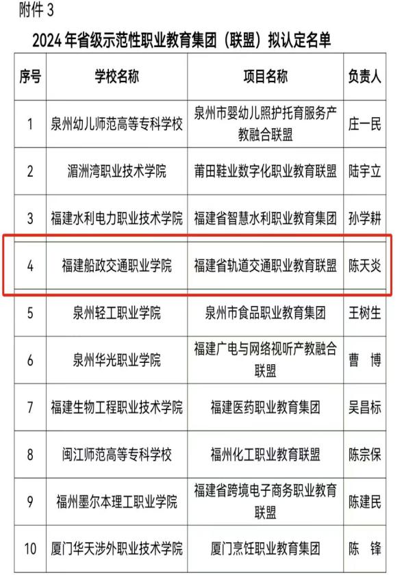 近日,福建省教育廳公布《2024年省級(jí)職業(yè)教育重點(diǎn)項(xiàng)目擬認(rèn)定名單》,由我院牽頭組建的福建省軌道交通職業(yè)教育聯(lián)盟被認(rèn)定為2024年省級(jí)示范性職業(yè)教育聯(lián)盟。