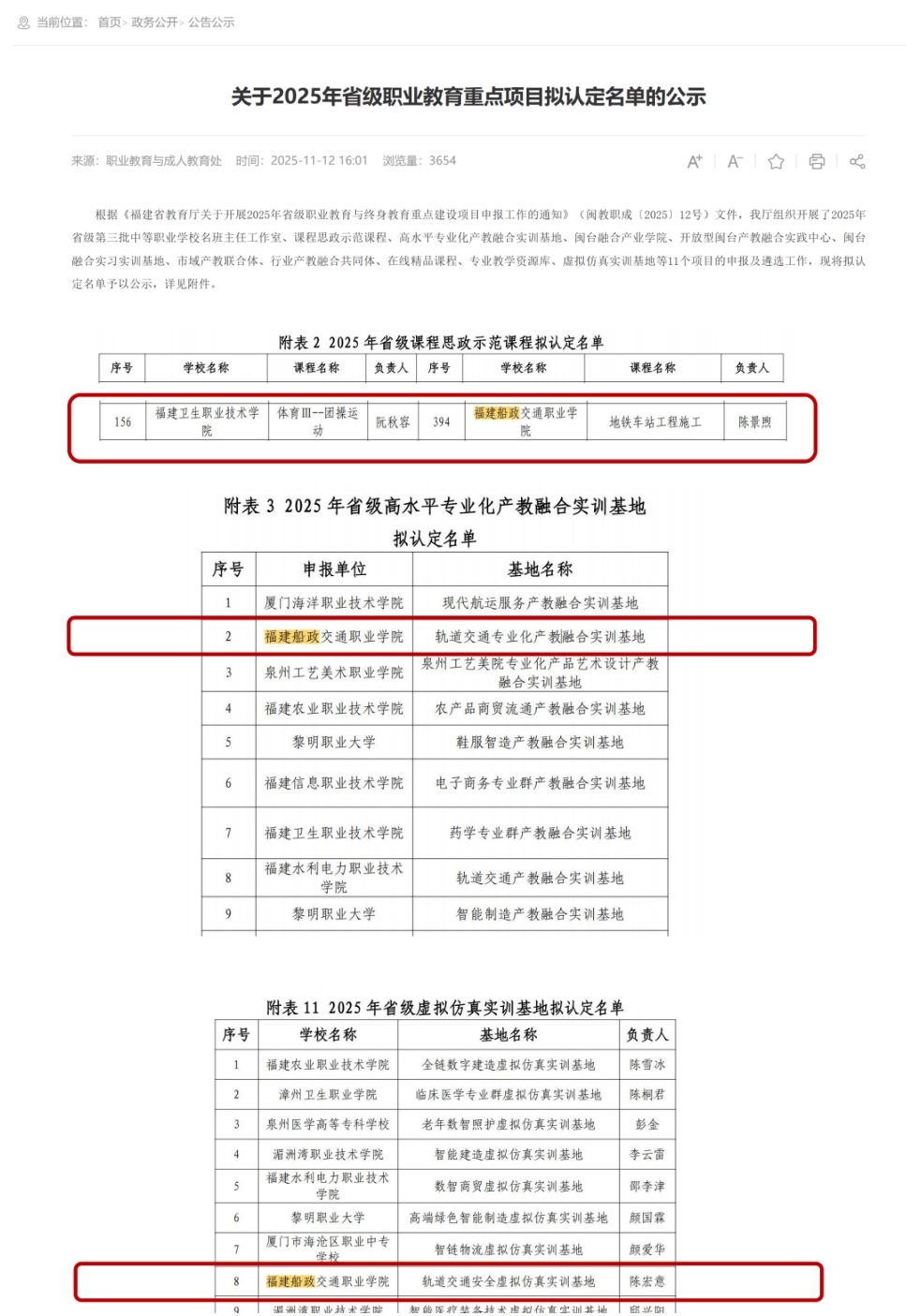 近日,福建省教育廳公布2025年省級(jí)職業(yè)教育重點(diǎn)項(xiàng)目擬認(rèn)定名單,軌道交通學(xué)院共有3個(gè)重點(diǎn)項(xiàng)目入圍。其中,陳天炎院長(zhǎng)牽頭負(fù)責(zé)的《軌道交通專業(yè)化產(chǎn)教融合實(shí)訓(xùn)基地》被認(rèn)定為2025年省級(jí)高水平專業(yè)化產(chǎn)教融合實(shí)訓(xùn)基地;陳宏意副院長(zhǎng)牽頭負(fù)責(zé)的《軌道交通安全虛擬仿真實(shí)訓(xùn)基地》被認(rèn)定為2025年省級(jí)虛擬仿真實(shí)訓(xùn)基地;陳景煦博士負(fù)責(zé)的《地鐵車站工程施工》被認(rèn)定為2025年省級(jí)課程思政示范課程。