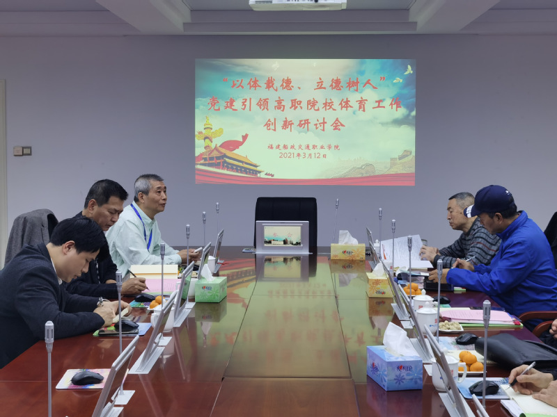 3月12日下午,通識(shí)教育學(xué)院召開“以體載德、立德樹人”黨建引領(lǐng)高職院校體育工作創(chuàng)新研討會(huì),會(huì)議邀請(qǐng)?jiān)=ㄊ〗逃龔d體衛(wèi)藝語(yǔ)處正處級(jí)調(diào)研員江仁虎、集美大學(xué)體育學(xué)院鄭旭旭教授、福建師范大學(xué)體育科學(xué)學(xué)院張涵勁教授、福州大學(xué)體育部彭雪涵教授、福建農(nóng)林大學(xué)體育部黃國(guó)龍教授、福建醫(yī)科大學(xué)體育部董華教授等專家,學(xué)院黨委書記張海明、通識(shí)教育學(xué)院院長(zhǎng)方儒欽、副院長(zhǎng)金晶晶和郭建忠參加會(huì)議。