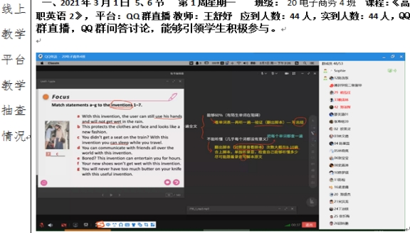 2、授課教師都能夠?qū)€上平臺技術(shù)、操作流程、交流互動(dòng)、教學(xué)資源使用等方面的掌控愈加熟練,對線上教學(xué)的各種優(yōu)勢愈發(fā)喜愛。學(xué)生學(xué)習(xí)整體上熱情較高,普遍認(rèn)為授課教師能備課充分,教學(xué)認(rèn)真,課件豐富,內(nèi)容容量大,對學(xué)生課堂簽到管理負(fù)責(zé),師生互動(dòng)方式靈活,學(xué)生參與度、活躍度高,教學(xué)效果良好。